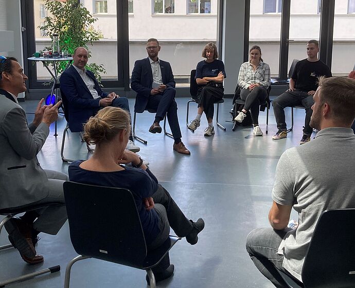 In der Podiumsdiskussion „StartUp statt Bewerbungen: Warum Selbständigkeit eine gute Karriereoption ist“ informierten Maximilian Laue (ThEx Enterprise), Martin Arnold-Schaarschmidt (Vorstand Plattform e.V.) und der FHE-Alumnus Frank Sonnabend (Gründer Kontor Erfurt | Defensionskaserne) die Studierenden.
