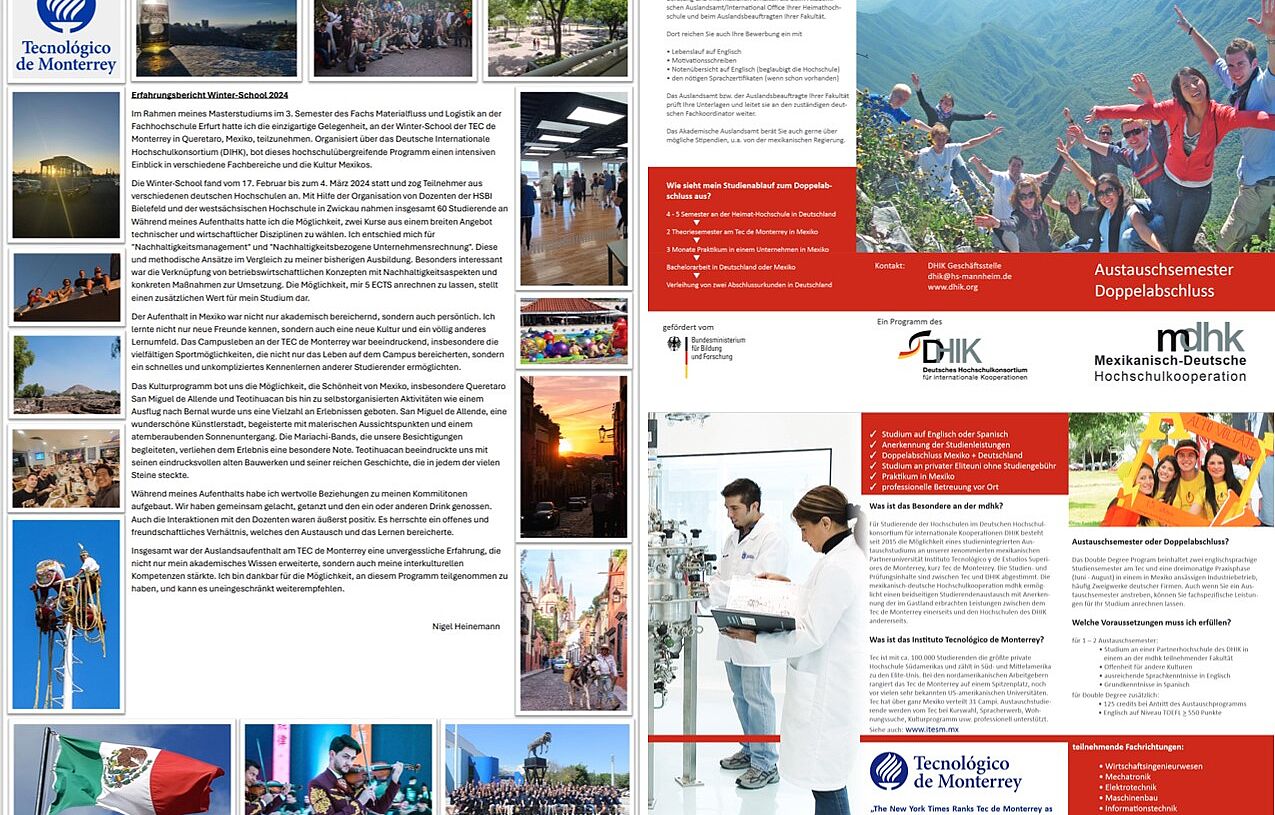 The German University Consortium for International Cooperation (DHIK), to which 28 German universities, including Fachhochschule Erfurt, are currently affiliated, has been focusing on the PR China (CDHAW) since 2004 and, for several years now, on Mexico (MDHK). Our partner in this endeavour is the Tec de Monterrey, the most important network of technical universities. It is also possible to broaden your horizons without spending a whole semester or year studying abroad, for example by taking part in field trips or summer and winter schools. One of our Master's students studying ‘Material Flow and Logistics’ had the opportunity to take part in February. Click here to view his illustrated travelogue.