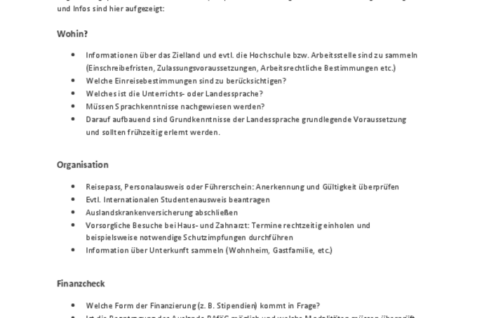 Die Checkliste zum Auslandsaufenthalt. Die Planung eines Auslandsaufenthalts sollte zuerst mit der Frage nach der geeigneten Form des Aufenthalts (Auslandssemester oder ein Auslandspraktikum) in Verbindung stehen. Zudem ist es wichtig, notwendige Schritte zur Vorbereitung frühzeitig (mindestens ein