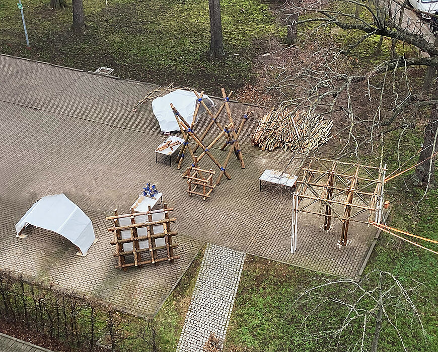 Das Projekt LogDesignBuild Bauhütte unternimmt die Realisierung einer der im Winter entworfenen Projekte für eine Überdachung als Schwachholzkonstruktion als Experimentalbau auf dem Parkplatz Schlüterstraße. Die Projektmethode ergänzt die Idee des DesignBuild um das Logging, also Aspekte der Rohstofferfassung/-gewinnung – als ganzheitliche Didaktik vermittelt es so den Bau mit Schwachholzsortierungen von Stamm bis Montage und innoviert in der Überbrückung von Rohstoff über Planungsprozesse bis zur Realisierung im 1:1. Im Format bringen die Studierenden dabei Fragen innnovativer konstruktiver Rohstoffnutzung, der forschungsnahen Erprobung einer neuen Bauweise und spezifischer programmatischen Anforderungen für die Nutzung am Campusstandort in Einklang. Seminar und Projektstudio laufen dabei parallel und greifen verschiedentlich Hand in Hand. Während in Letzterem die Konkretisierung des gewählten Projekts und damit verbundene Fragen des Entwurfs im Mittelpunkt stehen, werden im Seminar die planerischen Grundlagen für die Umsetzung erarbeitet.