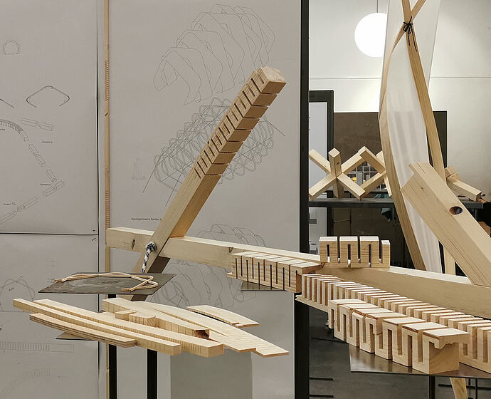 Das Projekt erprobt die Zusammenarbeit von Mensch, Material und Technologie im 1:1. Am Anwendunsgfall digitalen Holzbaus verfolgt es die Hypothese, dass Methoden des fabrication-aware design Engstellen zwischen digitalem Entwurf und Fertigung umkehren können – um sie zum Ausgangspunkt eines kollektiven Design&Build Projekts zu erklären. Im konstruktiven Spiel mit Hülle und Öffnung zielt es auf eine temporären Struktur zur Realisierung auf der digitalen CNC-Abbundanlage unseres Industriepartners. Iterativ, spekulativ und forschungsgetrieben arbeitet es an Fragen der (De-)Montage mit nicht-seriellen Fügungen, dem Konstruieren mit Roh- und Restmaterialien und der Planung mit aktiver Materialität. Begleitende Workshops zu Fragen hybrider Membranverwendung sowie dem konstruktiven Ingenieurholzbau mit externen Partnern und Exkursionen begleiten und vertiefen die studentischen Entwürf. Der Kurs fördert die Bildung individueller Haltungen zum digitalen Bauen als kollaborative, transdisziplinäre Praxis