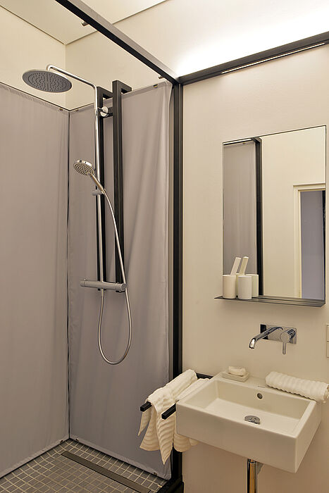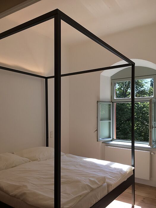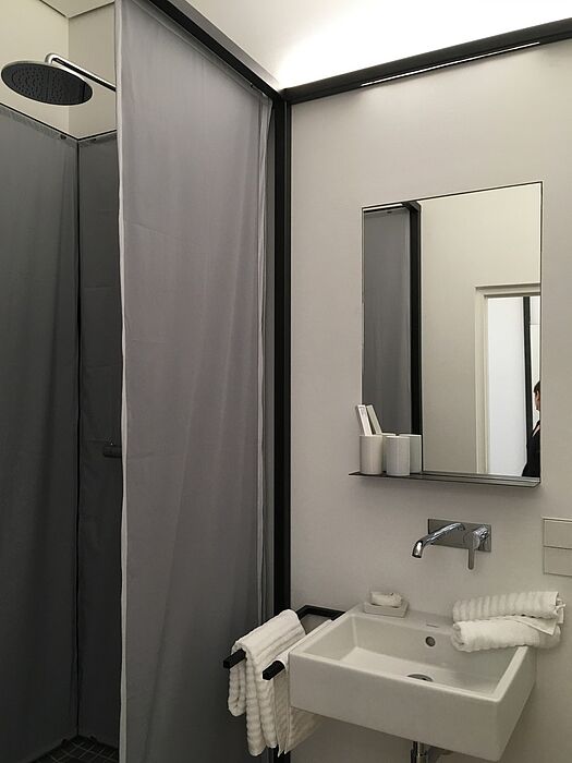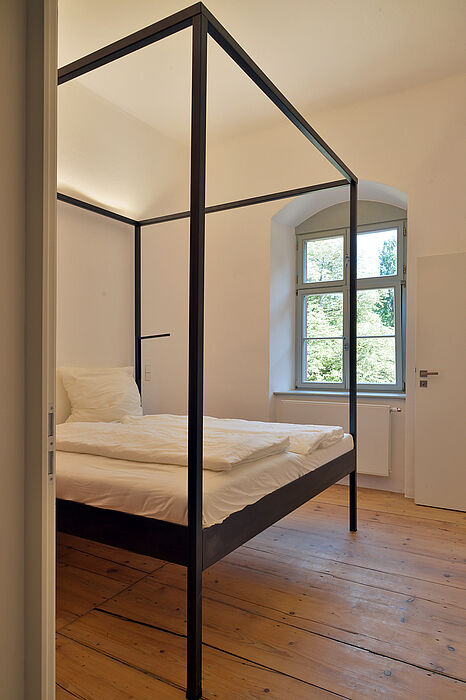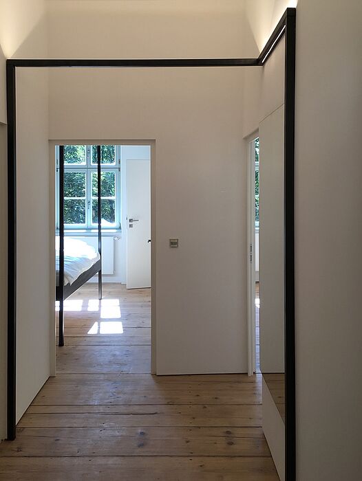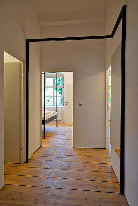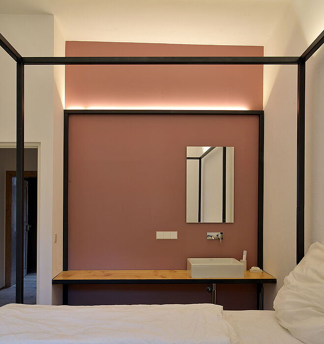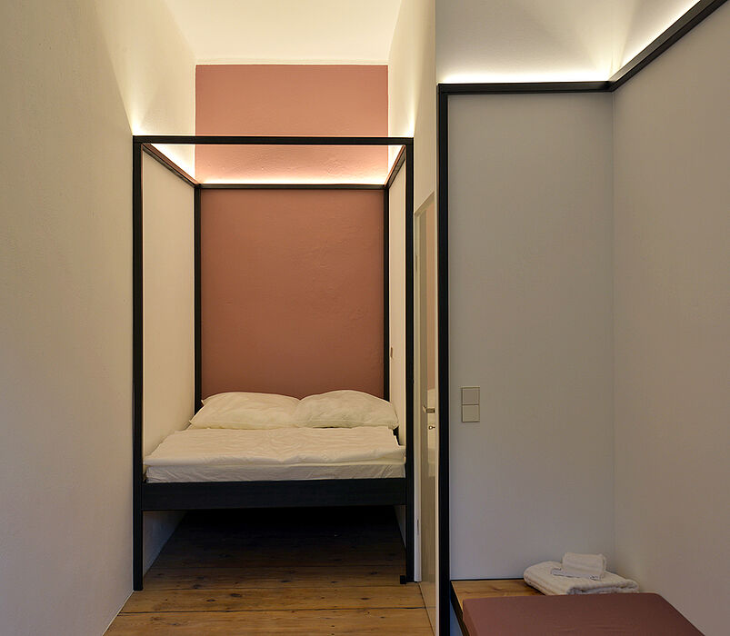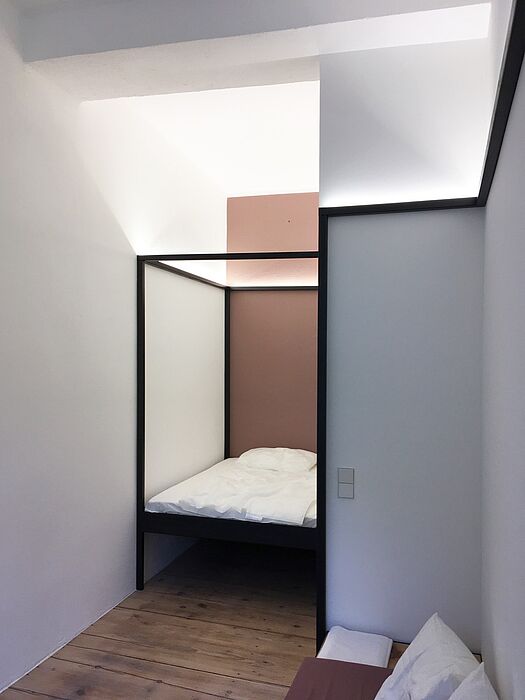 Das Experiment hat sich verstetigt: Im SoSe 2018 konnten zwei weitere Musterzimmer eingeweiht werden. Wieder hatten die Studierenden im Rahmen ihrer Bachelorthesis gute drei Monate Zeit, ein Konzept zu entwickeln, es baureif durchzuplanen und schließlich eigenhändig zu bauen. Elf Studierende fanden sich zusammen, um aus einem größeren Raum zwei kleinere mit Flur und Bad zu realisieren, eine Suite. Als Symbol feudalen Ruhens stand das Himmelbett Pate, in dessen filigrane Stahlkonstruktion das Lichtkonzept integriert wurde. Das große Zimmer verfügt neben dem Himmelbett, aus dem sich Leseleuchten ausklappen lassen, über eine eigene Waschgelegenheit, das kleinere über ein Doppelbett im Alkoven und ein Daybed. Das Motiv zieht sich als roter Faden durch alle Räume. Im Bad konnte mit wasserfestem Stoff eine Alternative zu den üblichen Wandfliesen entwickelt werden. Farbflächen akzentuieren die Räume. Das Motiv zackt sich durch den Flur und bewerkstelligt hier Beleuchtung und Garderobe. Liebevoll wurde das Parkett ergänzt und aufgearbeitet, die alte Tür samt Schloss akribisch restauriert. Sogar selbstgenähte Filzpantoffeln standen zur Übergabe bereit.