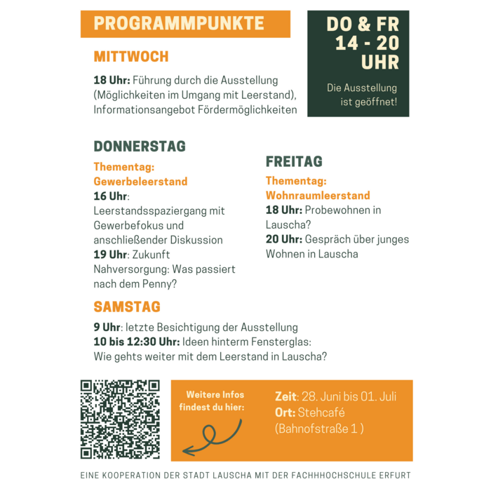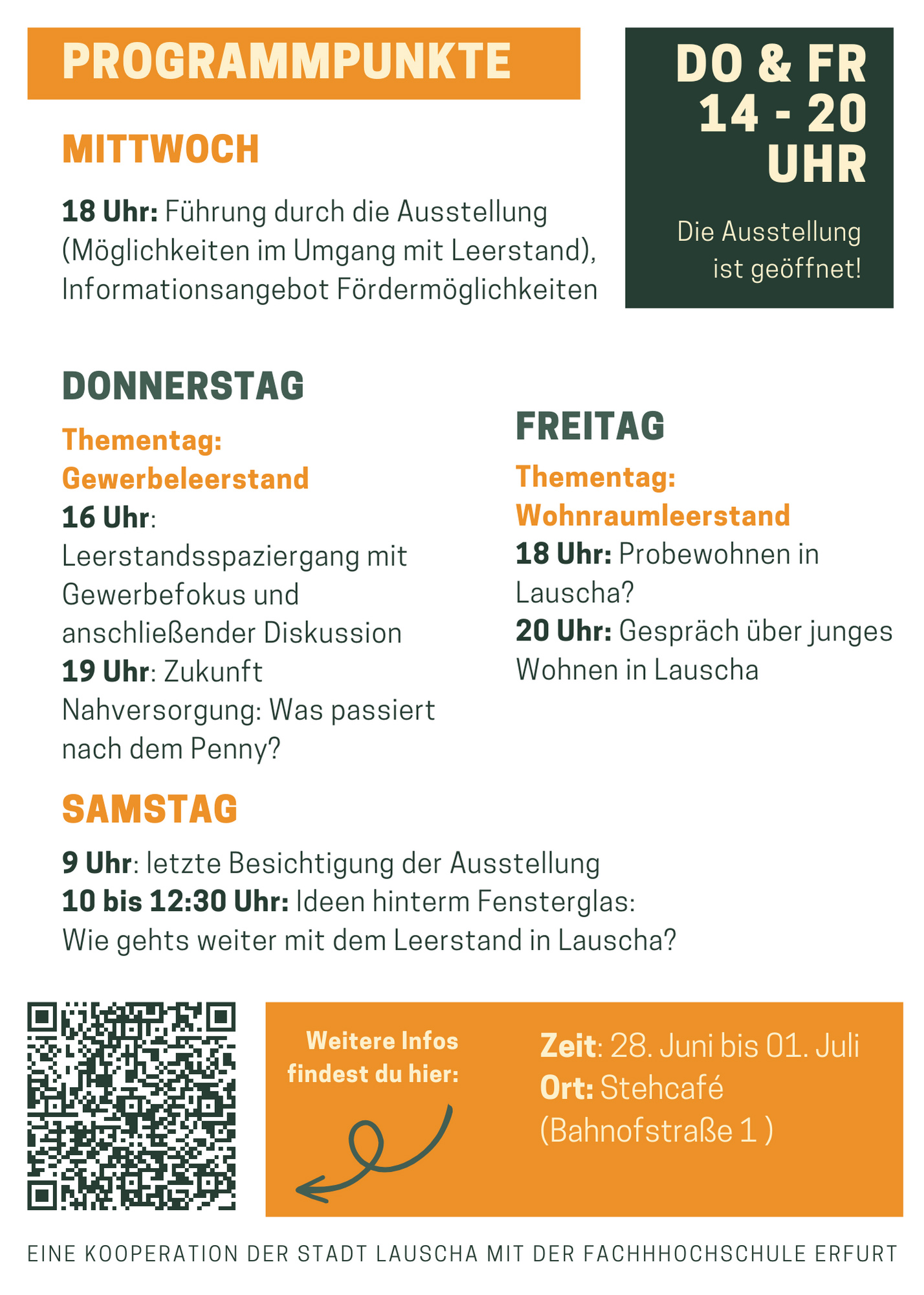 In der zweiten Projektwoche wird nun das Zukunftskonferenz-Motto „Wies wor wat nümmr - Ower wie wellmer`s denn?“ wieder aufgegriffen. Das pop-up „Leerstandscafé“ bietet Lauschnern Anregungen, sich über Leerstand vor Ort auszutauschen und stellt Projekte und Maßnahmen vor, die sich anderswo bereits bewährt haben. Zum Finale des Leerstandscafés sind alle dazu eingeladen, eigene Wünsche, Visionen und mögliche Umsetzungen für die Glasstadt zu benennen und gemeinsam zu diskutieren. Das Ziel dieser Kooperation zwischen der Stadt Lauscha und der Fachhochschule Erfurt ist eine Grundlage für den weiteren Umgang mit Wohn- und Gewerbeleerstand, die die lokalen Gegebenheiten mit erprobten Handlungsansätzen in Verbindung bringt.