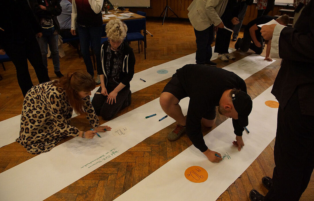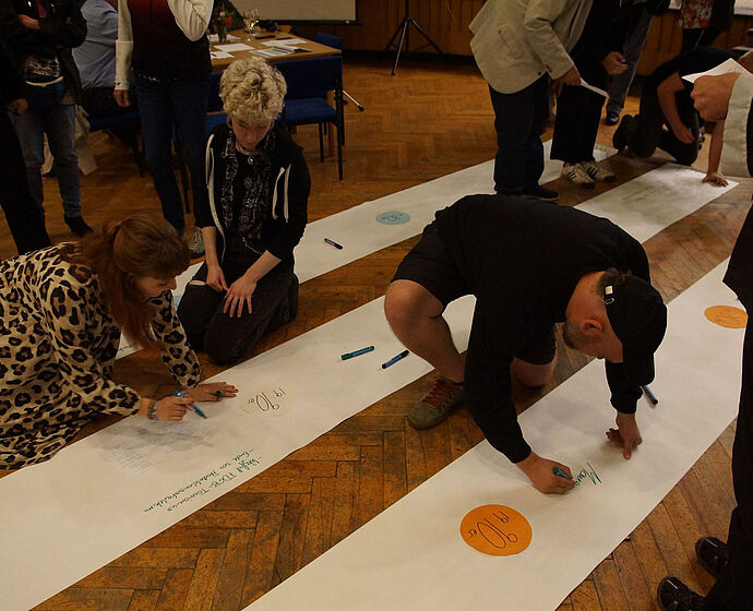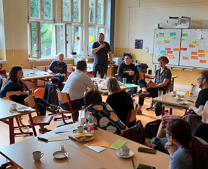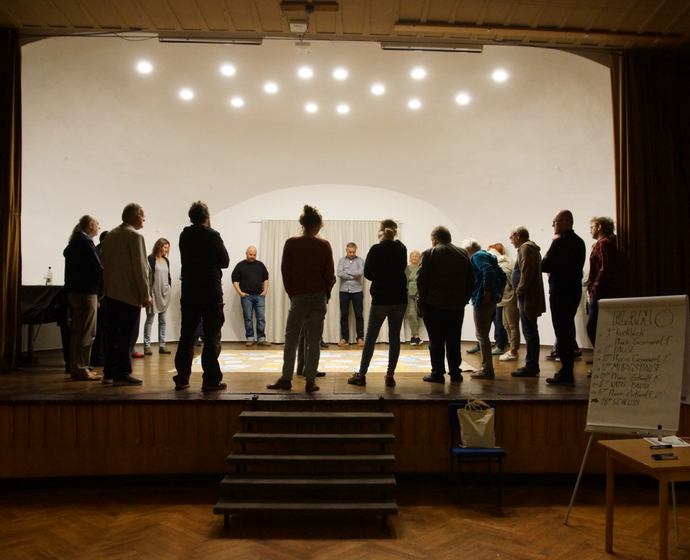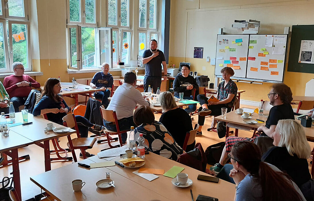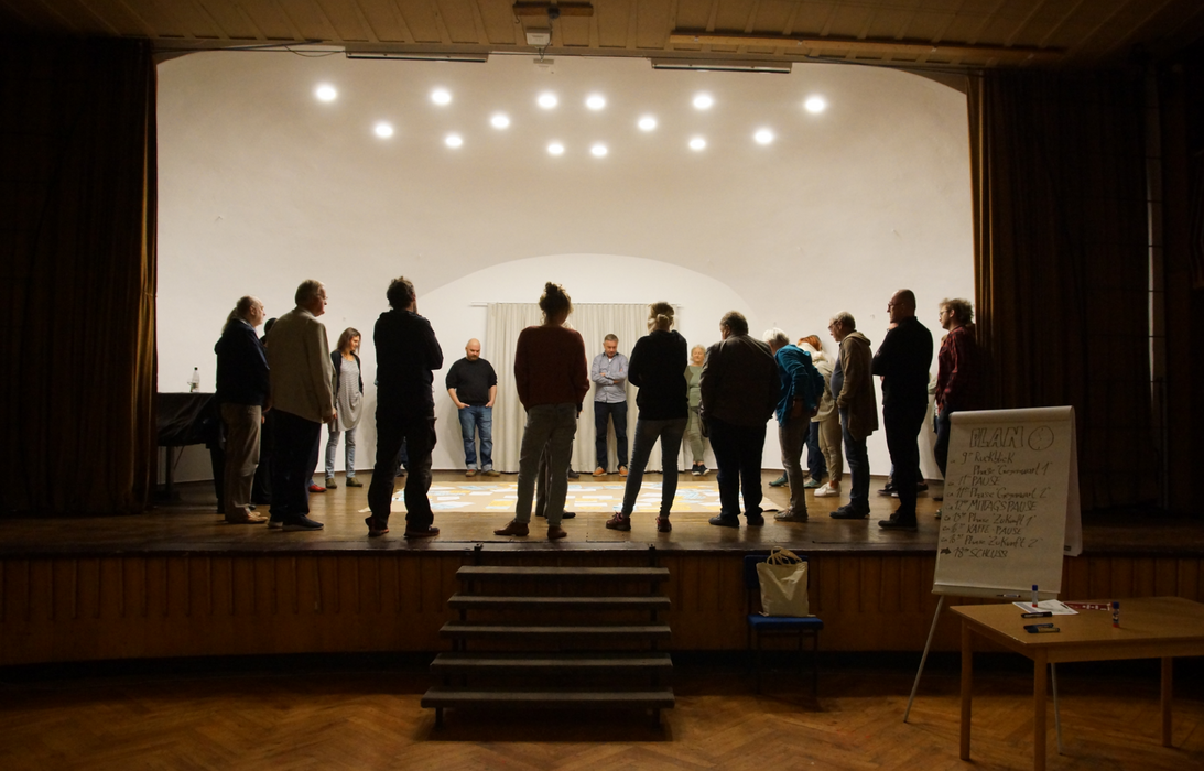 Zusätzlich zu den zwei Workshops hat das deutsche Team im September 2022 (2.-4. September) eine Zukunftskonferenz in Lauscha organisiert und durchgeführt. Ziele und Inhalt der Veranstaltung wurden von einer Gruppe engagierter Bürger:innen (der sog. Steuerungsgruppe) definiert und vorbereitet. Durch dieses Format sollte den Bewohner:innen von Lauscha und dem eingemeindeten Ernstthal ein Instrument zur Teilhabe an der Gestaltung ihrer Kommune geboten werden. Die Zukunftskonferenz in Lauscha stand unter dem Motto ‘Wies wor wat nümmr – Ower wie wellmer`s denn?’ (So, wie es war, wird es nicht mehr – aber wie wollen wir es denn haben?). Bis zu 40 Bürger:innen arbeiteten 2,5 Tage lang zusammen und besprachen relevante Themen, entwarfen Zukunftsvisionen und setzten utopische Ideen in realisierbare Arbeitspakete und Projekte um. Letztendlich wurden elf potenzielle Projekte entworfen, deren Realisierung zum Zeitpunkt des Projektendes bereits angeschoben wurde.