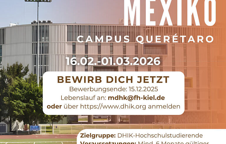 Bis 15.12.25 können Sie sich für die englischsprachige Winterschool in Mexiko bewerben, welche vom 16. Februar bis 1. März 2026 in Querétaro im gleichnamigen zentralmexikanischen Bundesstaat angeboten wird. Dazu folgen Sie bitte diesem Link. Vorbereitende Online-Informationsveranstaltungen führt die federführende FH Kiel an den Montagen 10., 17, und 24. November 2025 durch. Einen bebilderten Teilnehmerbericht aus dem Jahr 2024 finden Sie bei den archivierten Artikeln bzw. hier.