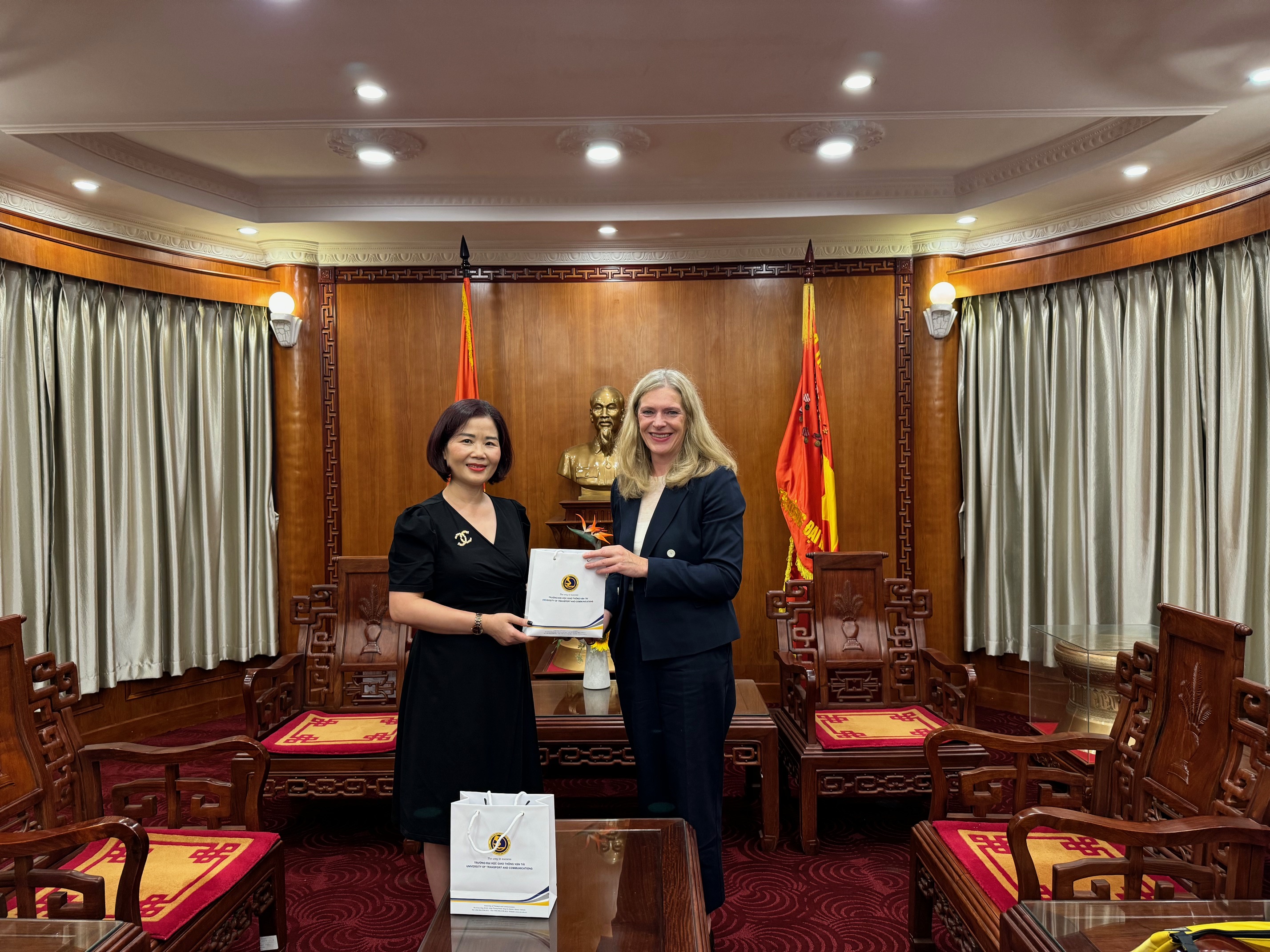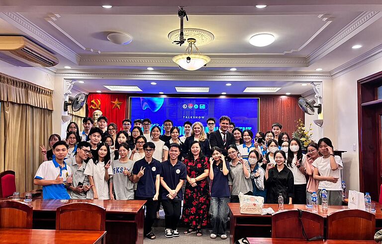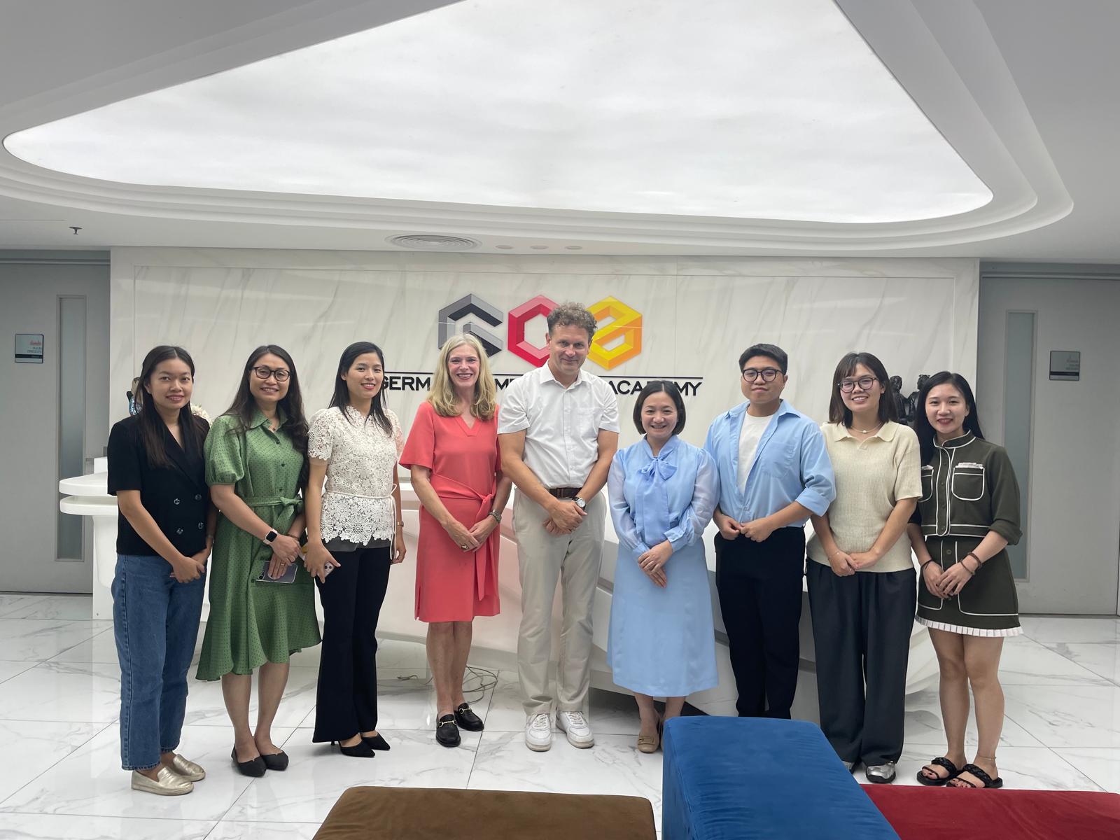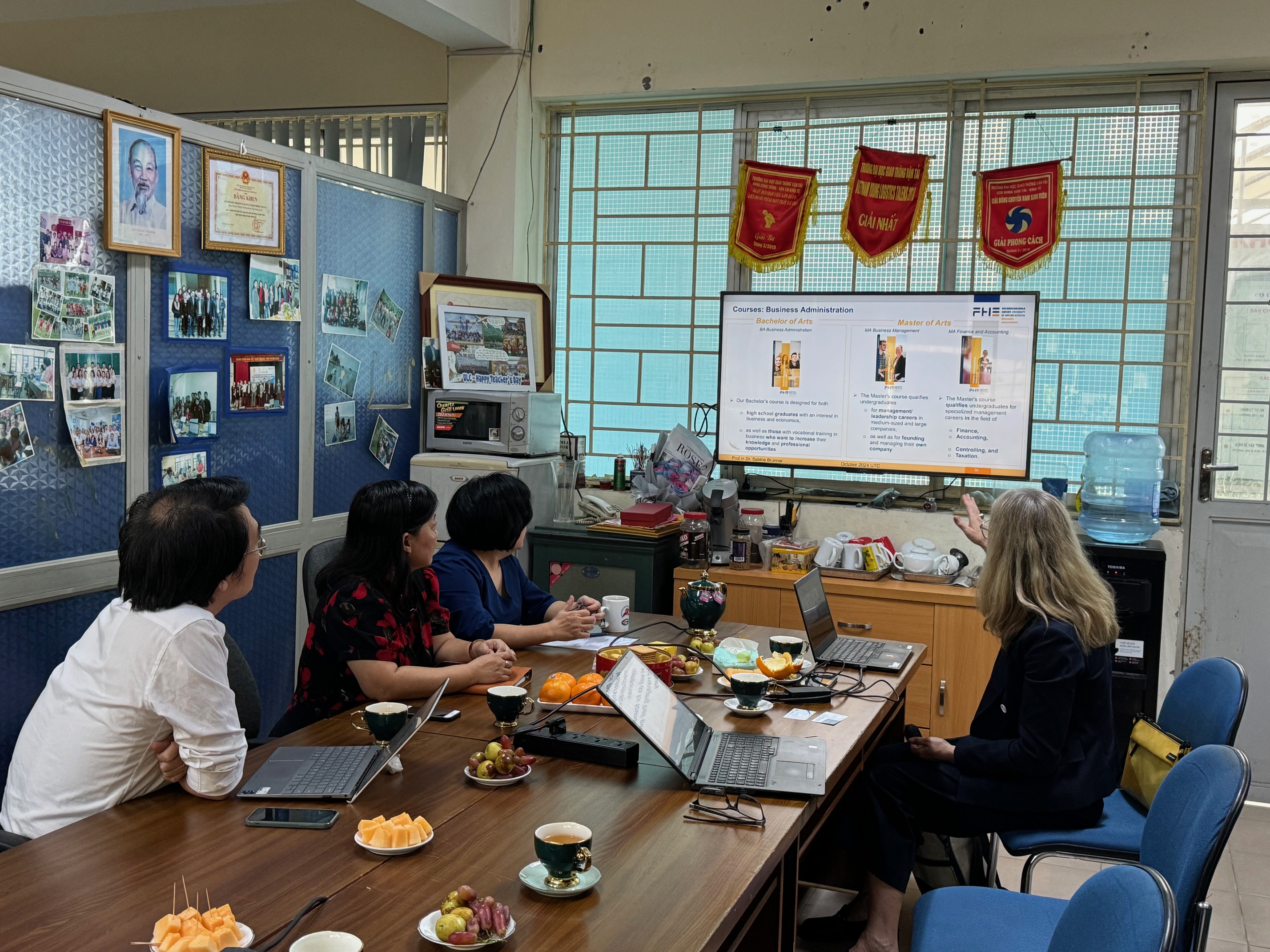 Professorin Brunner und Professor Heinitz waren Ende Oktober zu Gast an der Partnereinrichtung University of Transport and Communications (UTC) Hanoi. Sie hielten u.a. Vorlesungen (siehe Foto) zu Themen aus ihren jeweiligen Fachgebieten und führten Gespräche über den Ausbau der Kooperationsbeziehungen zwischen den Fakultäten. Teil des Programms waren auch ein Empfang durch das International Office und ein Gang über den Campus im Stadtteil Cau-Giay. Darüber hinaus folgten sie einer Einladung des IEC / German Competence Center, welches im Auftrag der Landesentwicklungsgesellschaft federführend bei der Gewinnung und sprachlichen Vorbereitung von jungen vietnamesischen Fachkräften für mehrere Sektoren der Thüringer Wirtschaft aktiv ist. In einem weiteren Vortrag stellten sie dort auf Wunsch der Gastgeber das deutsche (Fach-)Hochschulsystem - speziell duale und praxisintegrierte Studienangebote - vor.