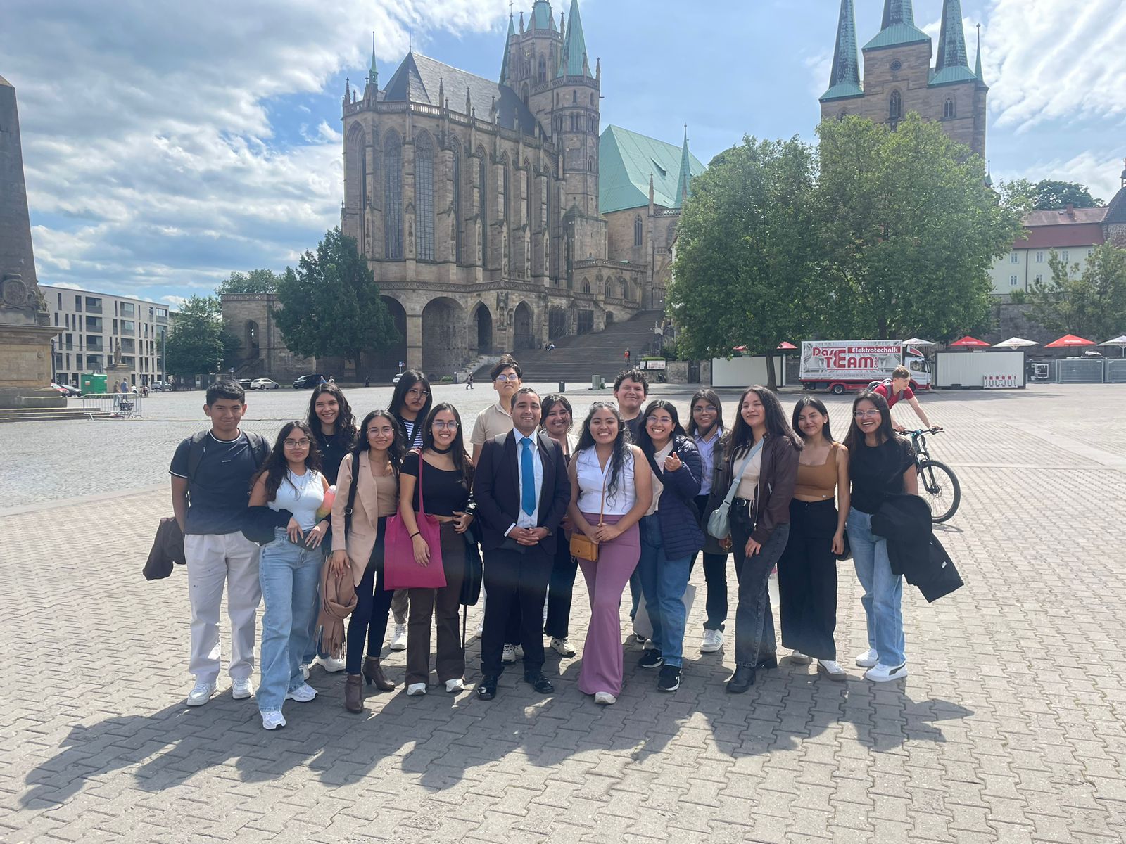 Im Juni war eine Gruppe des Fachbereichs International Business von der Universidad Nacional Mayor de San Marcos La Victoria / Lima unter der Leitung von Professor Víctor Hugo Fernández Bedoya im Rahmen ihrer vom DAAD geförderten Studienreise zu Gast an der FH Erfurt. Nach herzlicher Begrüßung an der Fakultät Wirtschaft-Logistik-Verkehr gestalteten Professorin Brunner, Professor Gröger und Professor Heinitz ein halbtägiges Besuchsprogramm. Der inhaltliche Schwerpunkt der Tour, welche die sechzehnköpfige Delegation von Düsseldorf über den Niederrhein und Marburg bis nach Thüringen führte, waren Fairer Handel, Nachhaltigkeit und Technologie am Beispiel des für Peru wichtigen Exportguts Kaffee. An einer Reihe von Hochschulstandorten, bei Stadtbesichtigungen sowie den Bahntransfers dazwischen konnten sich die Teilnehmer ein aktuelles Bild von Deutschland machen, zu ihrem Projektthema recherchieren und dabei mit Kommilitonen und Forschern in Erfahrungsaustausch treten. Von hiesiger Seite war es wertvoll neue Kontakte zu knüpfen und Näheres über die akademische Ausbildung, die Infrastrukturentwicklung des Landes und die dortige Perspektive auf handelsbeeinflussende Maßnahmen wie die Lieferkettengesetze zu erfahren. (Fotos: UNMSM)