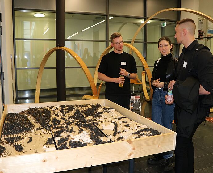 Die Teilnehmenden des Holzbautags erlebten eine inspirierende Veranstaltung mit hochkarätigen Vorträgen. Thematisch wurde der Rahmen durch die Holzbauaktivitäten des Thüringer Ministeriums für Infrastruktur und Landwirtschaft und die Holzbauinitiative des Bundes gesetzt. Mit den Professoren für interdisziplinären Holzbau und für Digitale Fabrikation stellten zwei neue Akteure der Fachhochschule Erfurt ihre Visionen und Ziele für die zukünftige Lehre und Forschung im Holzbau vor. Ideen für die Umstrukturierung des ehemaligen Wohngebietes Suhl-Nord zeigten die Potenziale und die Perspektiven einer regionalen, nachhaltigen Holznutzung aus dem Thüringer Wald durch das WIR-Projekt Holz-21-regio auf. Konkrete Bauprojekte wie die Andreas-Gärten in Erfurt und das forstliche Bildungszentrum Gehren wurden ebenso vorgestellt wie innovative Entwicklungen für die Konstruktion von hochtragfähigen, weitgespannten Geschossdecken und die effiziente Montage von Wandelementen unter Nutzung digitaler Fabrikationsmethoden.