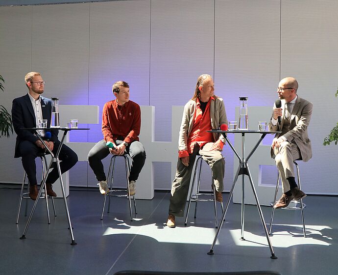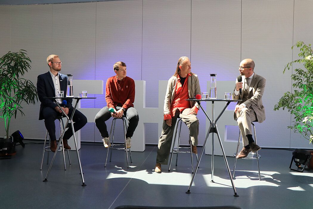 In der Podiumsdiskussion „StartUp statt Bewerbungen: Warum Selbständigkeit eine gute Karriereoption ist“ informierten Maximilian Laue (ThEx Enterprise), Martin Arnold-Schaarschmidt (Vorstand Plattform e.V.) und der FHE-Alumnus Frank Sonnabend (Gründer Kontor Erfurt | Defensionskaserne) die Studierenden.