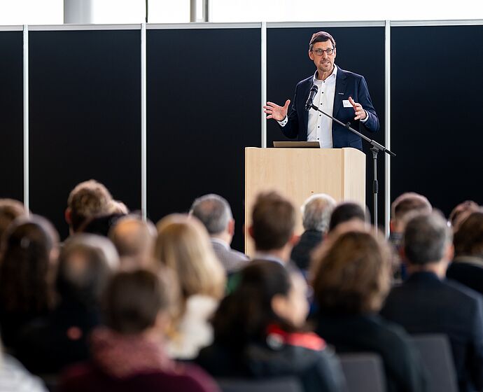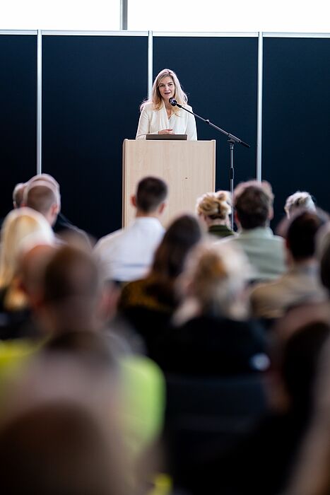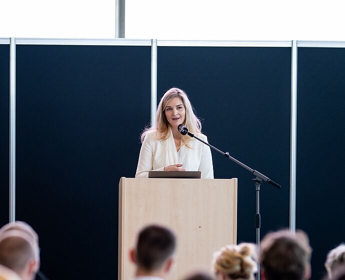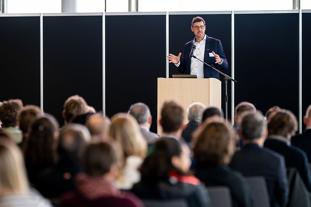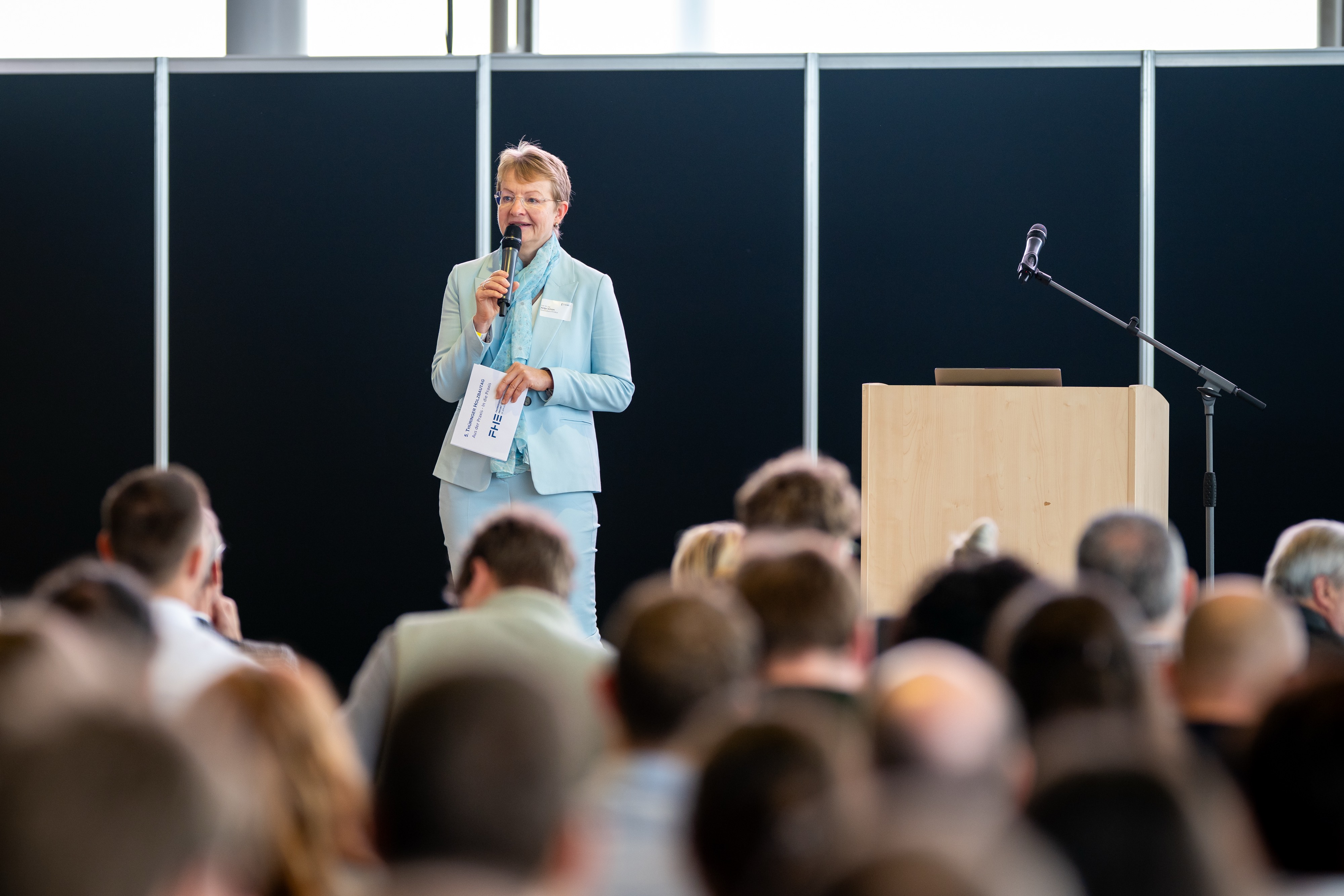 In seiner Begrüßung zog Prof. Dr. Frank Setzer, Präsident der FH Erfurt, eine positive Bilanz und betonte die Bedeutung des Holzbaus für nachhaltiges und ressourcenschonendes Bauen. Anschließend richtete Milen Starke, Staatssekretärin im Thüringer Minister für Digitales und Infrastruktur, ein Grußwort an die Teilnehmenden.