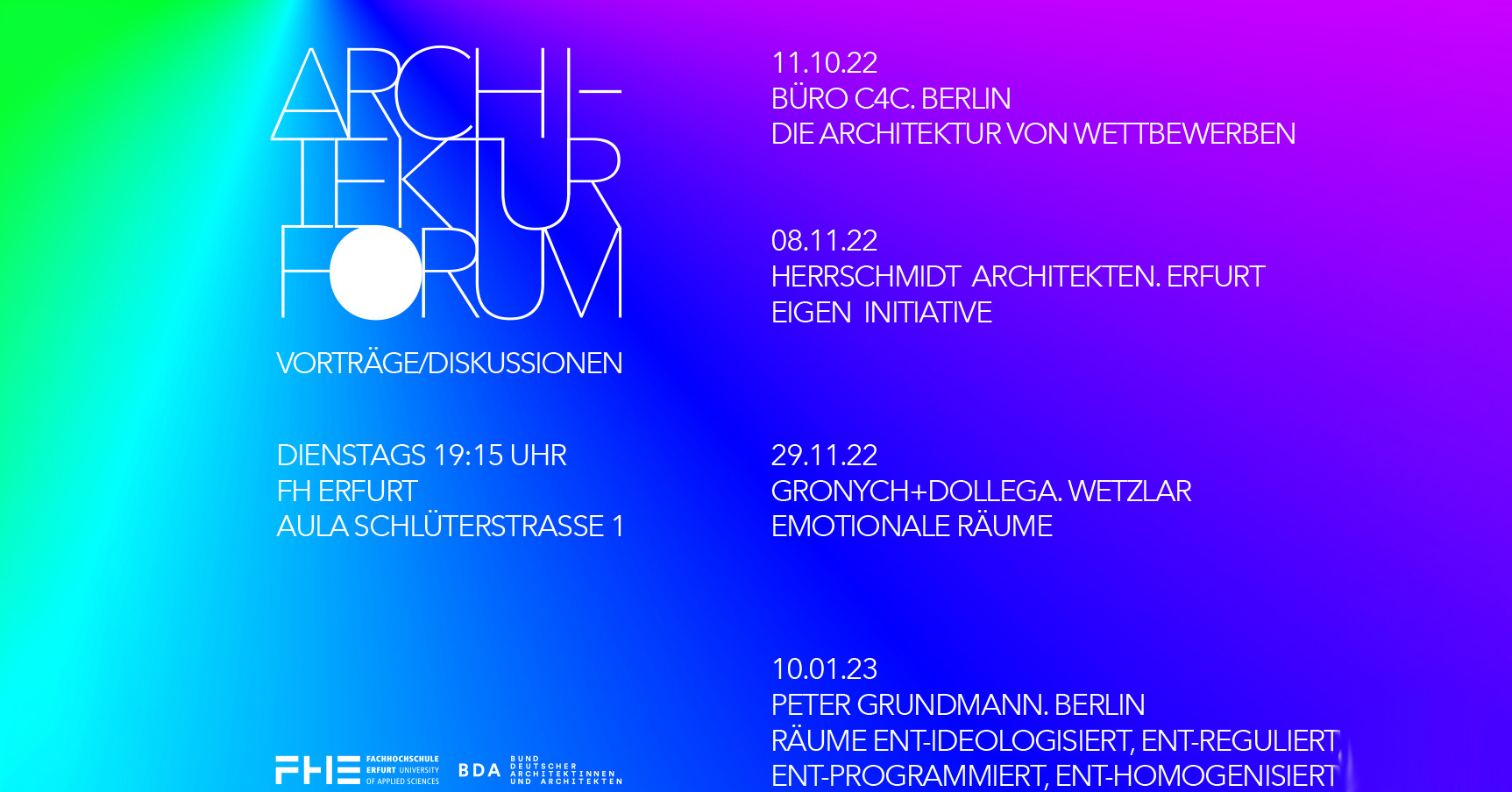 Die Fachrichtung Architektur der Fachhochschule Erfurt und der BDA Thüringen laden ein zu Vorträgen und Diskussionen im Rahmen des diessemestrigen Architekturforums.