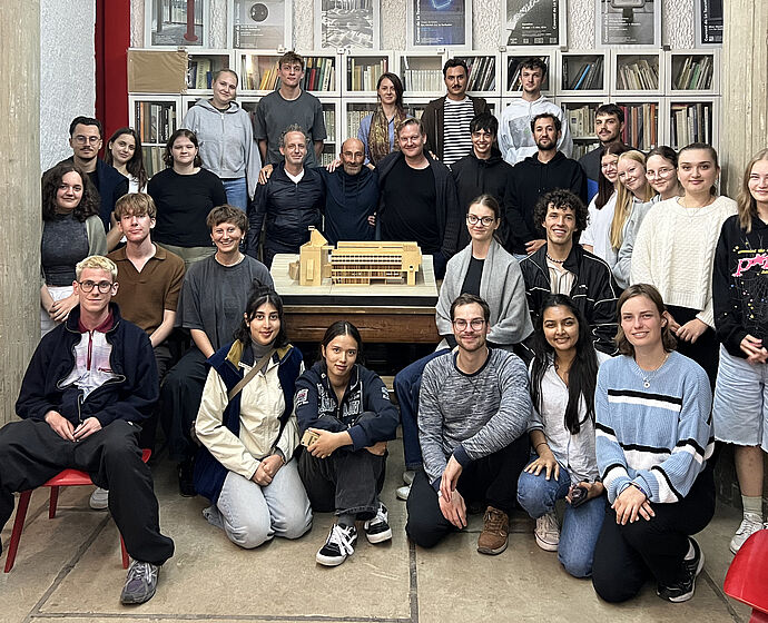 Im Rahmen ihrer Architekturexkursion entlang der Biskaya zur Architektur von Le Corbusier, Santiago Calatrava, Jean Nouvel und Rem Koolhaas übergaben Architekturstudent:innen der FH Erfurt mit ihren Professor:innen ein Modell im Maßstab 1:200 an das Kloster Saint-Marie de la Tourette. Der Dominikanerbruder und Architekt Charles Desjobert des weltberühmten Klosters nahm das Modell mit großer Freude stellvertretend für seine Mitbrüder entgegen. Künftig können sich die Besucher von La Tourette anhand des detailgetreuen Holzmodells einen hervorragenden Überblick über das Gebäude verschaffen.