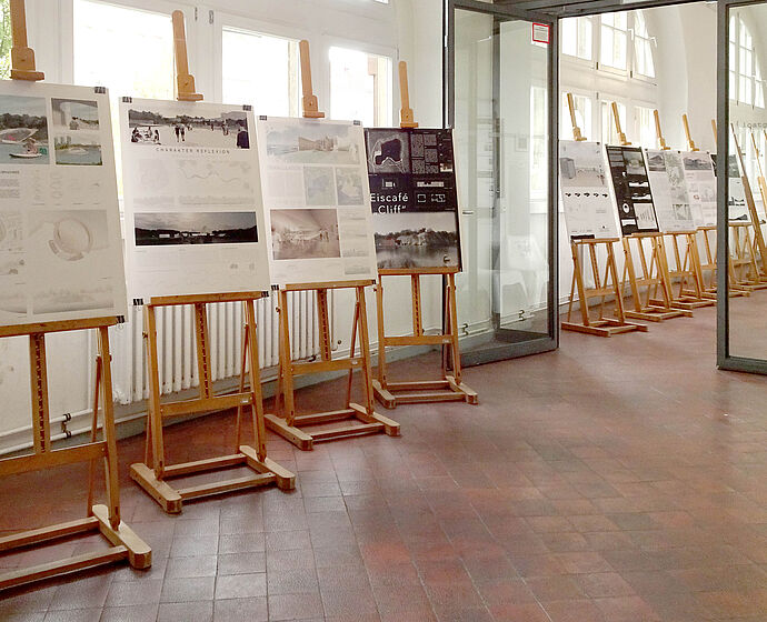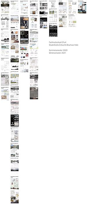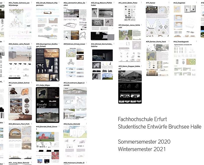 Die im 4. Semester Bachelor im Rahmen des Seminars "Digitale Darstellen und Gestalten II" darstellerisch und entwurflich weiterentwickelten Entwürfe aus dem 2. Semester Bachelor 2020 zum Bruchsee in Halle sind in der Schlüterstraße ausgestellt.