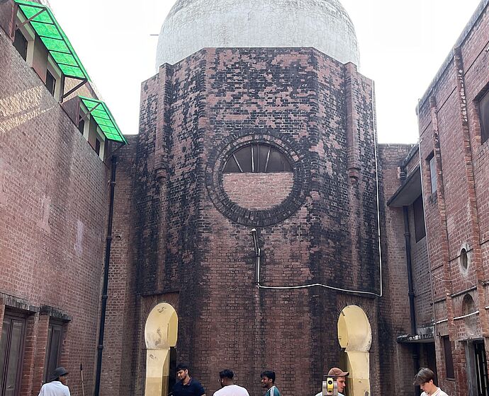 Acht zukünftige Bauingenieur:innen aus Erfurt hielten sich letzte Woche mit zwei Hochschullehrern, Dipl.-Ing. Stangenberger und Prof. Schick, in New Delhi, Indien auf. Sie vermessen gemeinsam mit indischen Kommiliton:innen ein historisches Gebäude aus den 1930er Jahren. Der österreichische Architekt des Gebäudes, Karl Malte von Heinz, ist in dieser Zeit nach Indien emigriert. Er kombiniert indische Architekturelemente mit denen des Bauhauses.