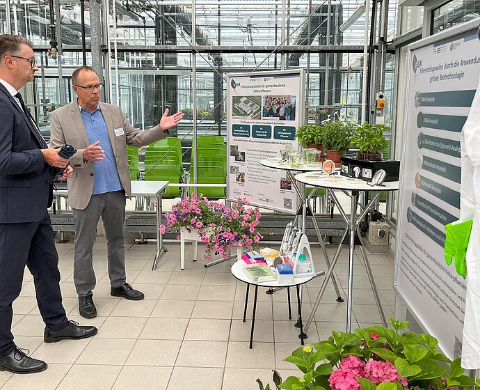 Vertreter:innen des Thüringer Kompetenzzentrums Holz, Ressourcenmanagement und Nachhaltigkeit (HRN) an der FH Erfurt berichteten über ihre Kooperationsprojekte, u.a. zu Robotik im Holzbau. Und die Vertreter:innen unserer Forschungsstelle für gartenbauliche Kulturpflanzen (FGK) gaben Einblicke in ihre Forschung – etwa für die Steigerung der Biodiversität und für klimaangepasste Pflanzen.