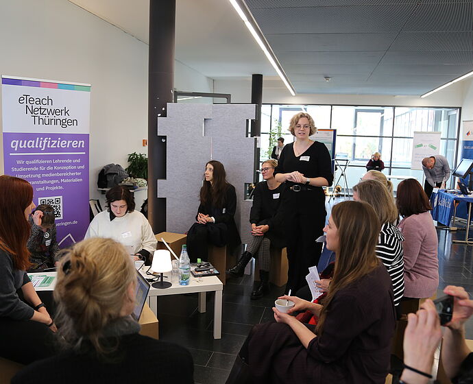Die diesjährige Tagung des eTeach-Netzwerks Thüringen fand am 15. und 16. November 2023 unter dem Titel „Zwischen Bibo und Bot: Studierende im Blick“ statt. Gastgebende Hochschule war in diesem Jahr die FH Erfurt, die an den beiden Tagen für die Tagungsgäste sowohl Messegeschehen inkl. Posterpräsentationen, Austausch an Themeninseln, Diskussionen im Rahmen von Barcamps und Mini-Workshops, Inputs in Form von Keynotes und thematischen Schlaglichtern – und nicht zuletzt auch offene Labore und somit direkte Einblicke in Forschung und Lehre an der FHE ermöglichte.
