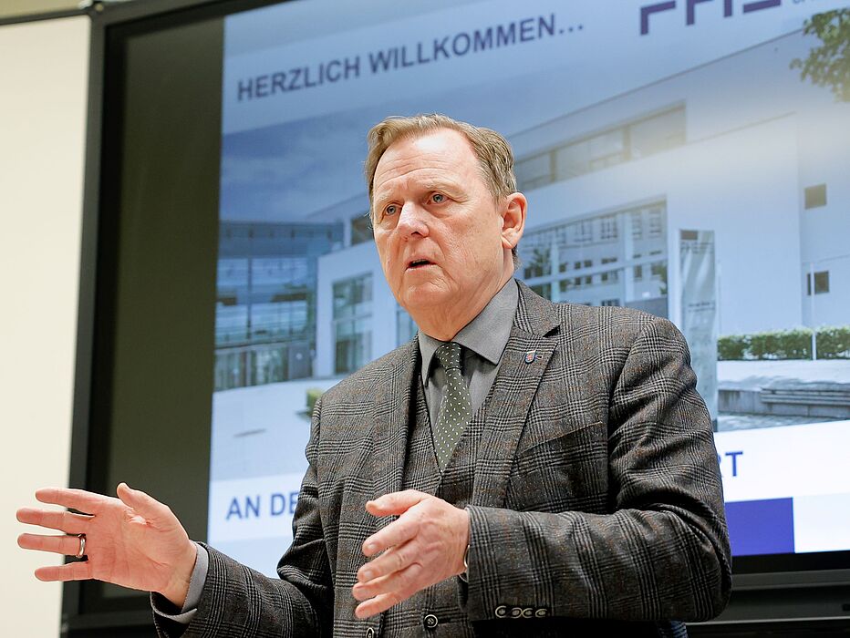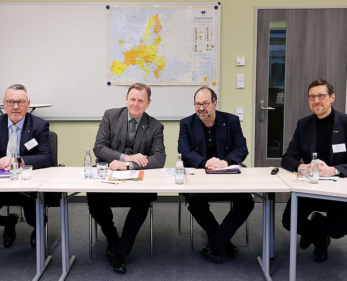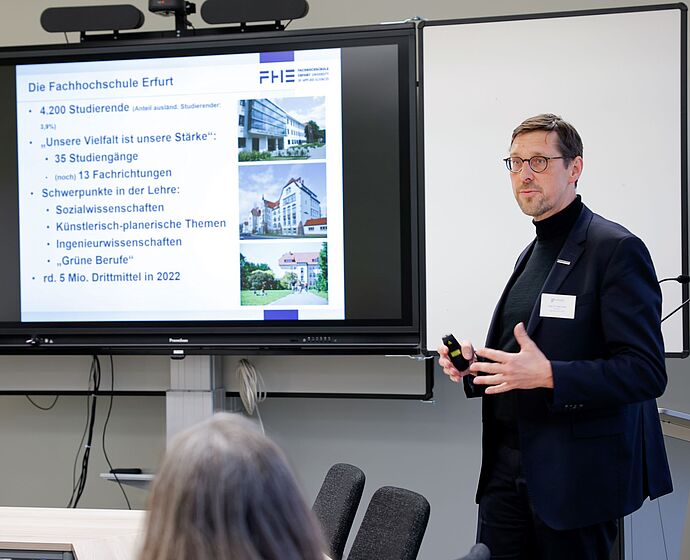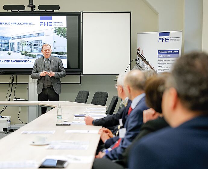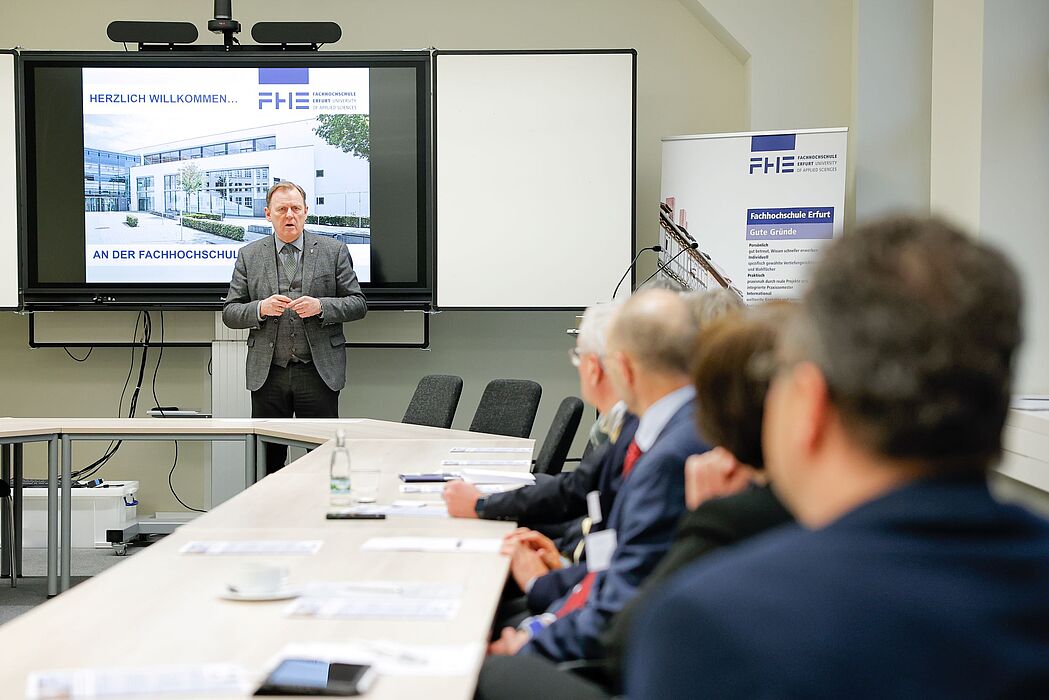 „Ein Unternehmen, dass sich für Studierende zum Ende deren Studiums interessiert, hat verloren. Die Umwerbung der Studierenden als zukünftige Fachkräfte beginnt am ersten Tag des ersten Semesters! An der FH Erfurt wird der Praxisbezug des Studiums großgeschrieben – die Fachhochschule versteht sich als Kooperationspartner der Firmen. Die dualen Studiengänge sind nur ein Beispiel dafür. Wuchern Sie als Unternehmen mit diesem Pfund“, so der Appell von FHE-Präsident Prof. Dr. Frank Setzer bei der Sitzung der Landesfachkommission „Arbeitsmarkt und Bildungspolitik“ des Wirtschaftsrats, der am 07.03.2023 am Campus Altonaer Straße zu Gast war.