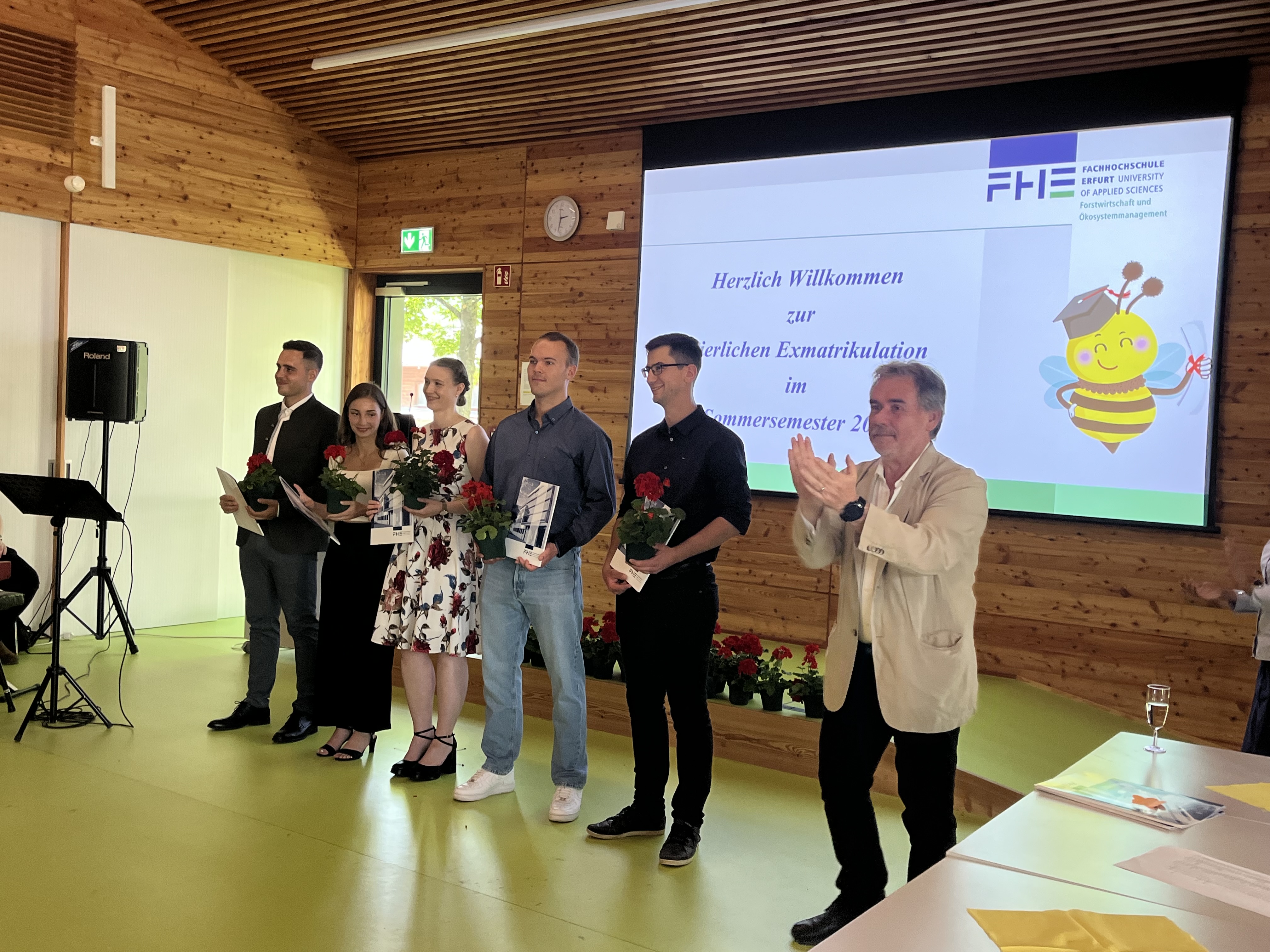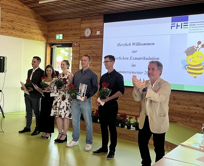 Punkt 14:00 Uhr begann die feierliche Zeremonie im Holzhörsaal (Hörsaal 4.E.01) am Grünen Campus der FH Erfurt in der Leipziger Straße. In einer kurzen Festrede wies der Studiengangsleiter der FR Forst, Prof. Dr. Dirk Landgraf, auf die Herausforderungen der letzten Jahre hin und würdigte die Bereitschaft aller Studierenden aber auch des Lehrkörpers, diese mit den bestmöglichen Ergebnissen zu meistern.