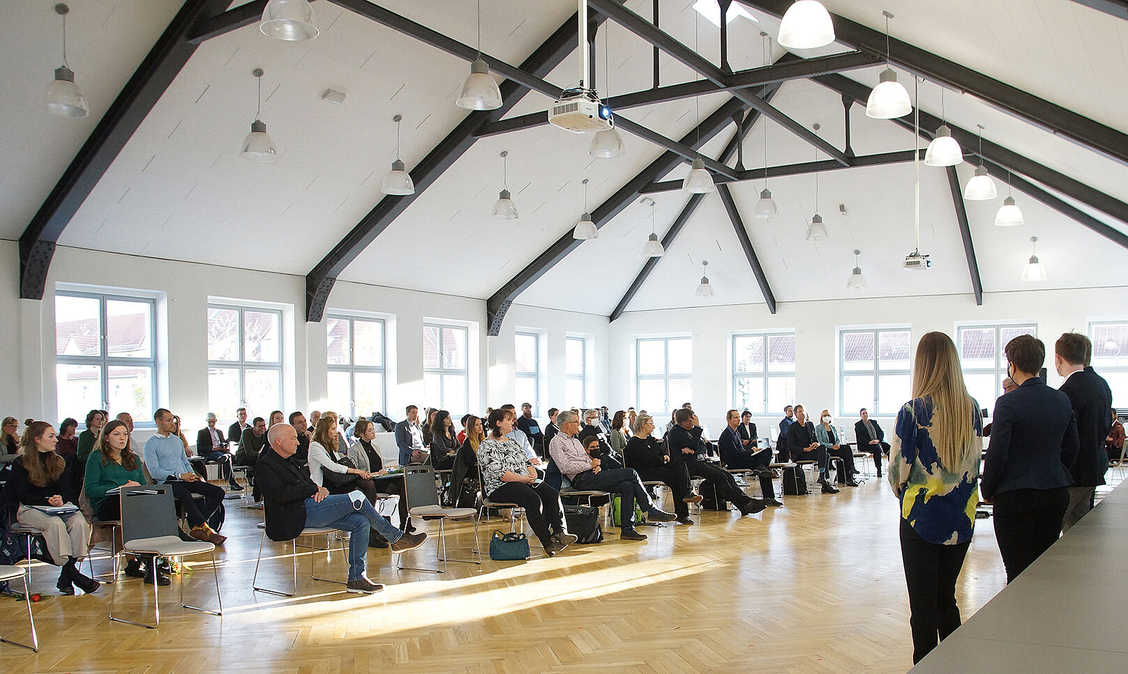 Nach einer Begrüßung durch Prof.in Yvonne Brandenburger - Vizepräsidentin für Forschung und Transfer - folgte Gastredner Dr.-Ing. Bertram Schiffers, seit 2015 Projektleiter bei der Internationalen Bauausstellung Thüringen. In seinem Vortrag lobte er zunächst das Durchhaltevermögen der Studierenden, unter den erschwerten Bedingungen, ihr Studium erfolgreich abzuschließen. Thematisch stünden derzeitige Planungen und der begrenzte Boden im Spannungsfeld zwischen Klimawandel und Kapital von Investoren. Gleichzeitig gelte es dem Gemeinwohl gerecht zu werden und nicht zuletzt die baurechtlichen Aspekte zu berücksichtigen. Die Entwicklung der Städte gehe nun von der autogerechten zur handygerechten Stadt. Parallel dazu müsse aber auch die analoge Weiterentwicklung öffentlicher Räume mitgedacht werden. Die Absolventen seien aufgefordert im Berufsleben die richtige Flughöhe zu finden und den Horizont nicht aus den Augen zu lassen.