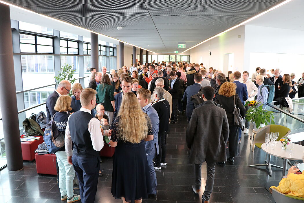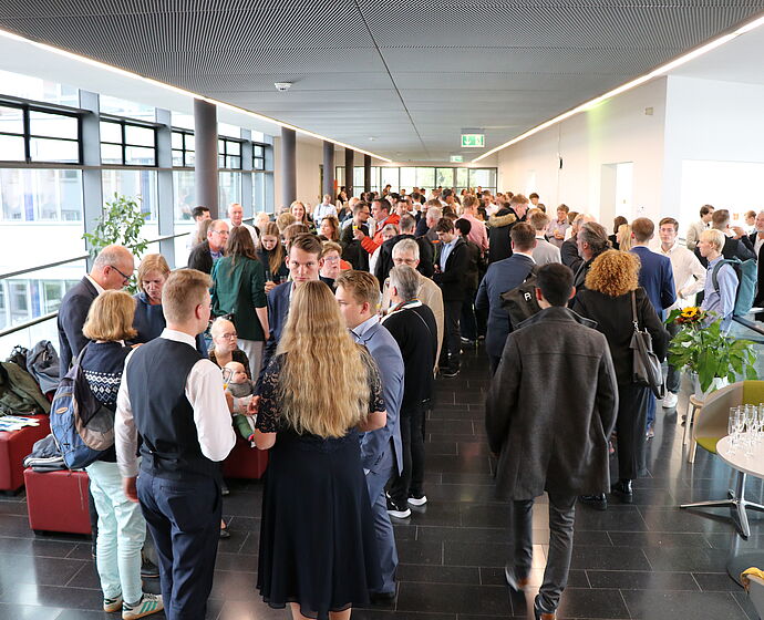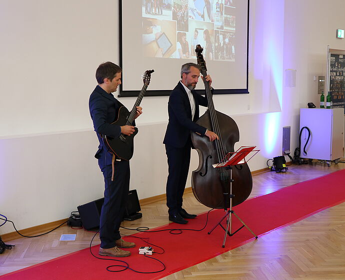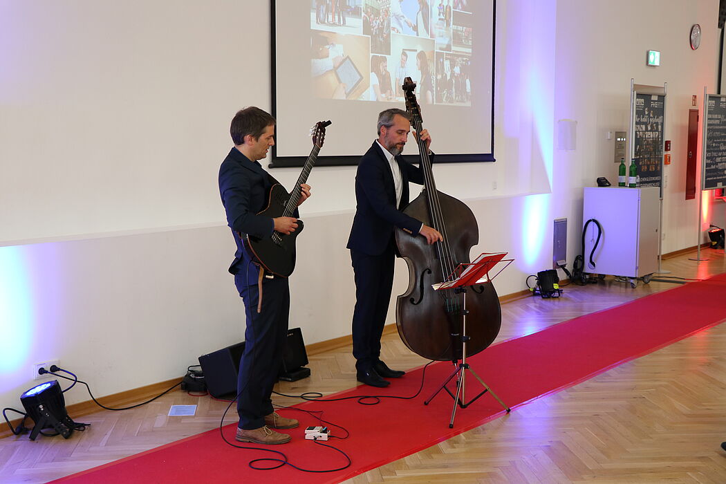Die „Turnhalle“ (Raum 6.2.46) verwandelte sich in einen würdigen Festsaal, während das obere Foyer im Haus 8 zum gemütlichen Loungebereich für den Sektempfang wurde. Dies bot einen stimmungsvollen Rahmen für die Absolventinnen und Absolventen, ihre Angehörigen sowie die geladenen Gäste unserer Partnerfirmen und -institutionen. Musikalisch begleitet wurden die Feiern durch das NyponSyskon Duo aus Jena - mit einem Kontrabass und einer Gitarre erklangen wunderschöne Melodien, die das Programm stilvoll bereichert haben.