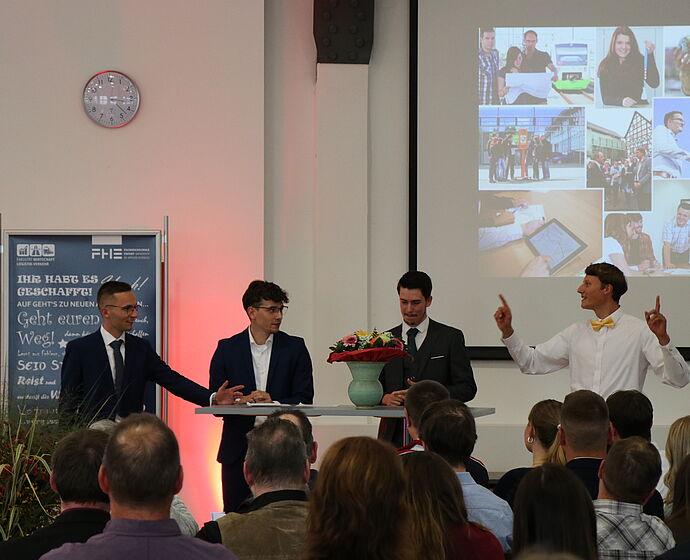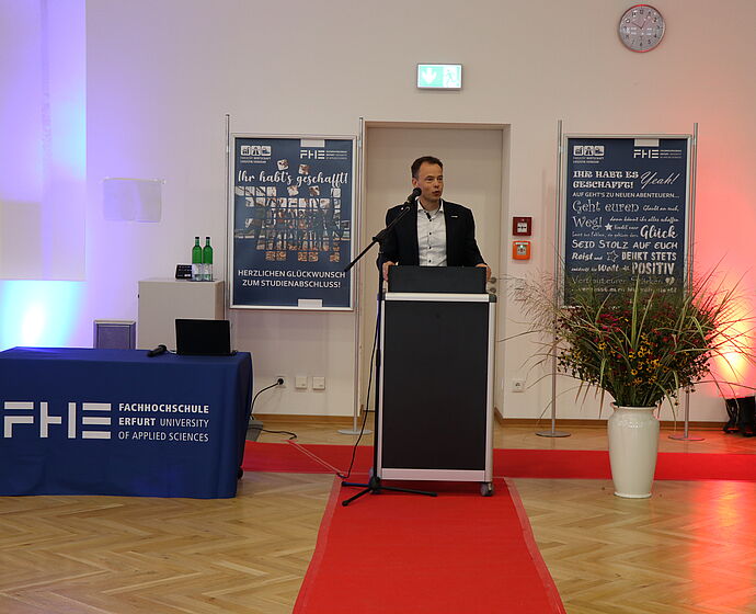 Prof. Gröger als Dekan begrüßte im Namen der Fakultätsleitung beide Veranstaltungen. Unser Präsident Prof. Setzer sprach das Grußwort der Hochschulleitung. Außerdem konnte für die Fachrichtung Wirtschaftswissenschaften Dr. Spieß (Leiter Unternehmenskommunikation Landesentwicklungsgesellschaft Thüringen mbH) und für die Fachrichtung Verkehrs- und Transportwesen Herr Laube (Vorstand der Erfurter Verkehrsbetriebe AG) als Festredner gewonnen werden. Ein besonderes Highlight waren die Reden und höchst unterhaltsamen Beiträge der Absolventinnen und Absolventen.