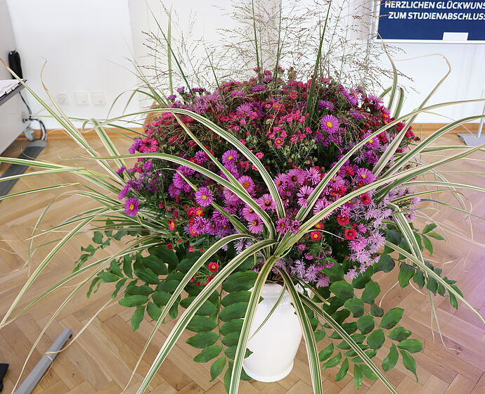 Die Fördervereine beider Fachrichtungen haben dankenswerter Weise die Blumen und Präsente für die Absolventinnen und Absolventen und die Getränke für den sich anschließenden Empfang finanziell ermöglicht. Der Dank geht auch an die Fakultät Landschaftsarchitektur, Gartenbau und Forst für den wunderschönen Blumenschmuck.