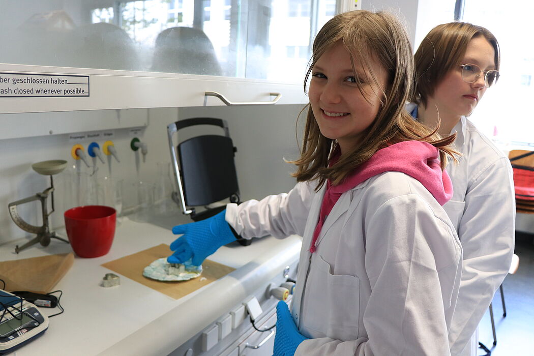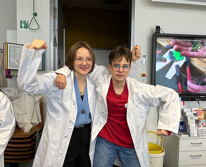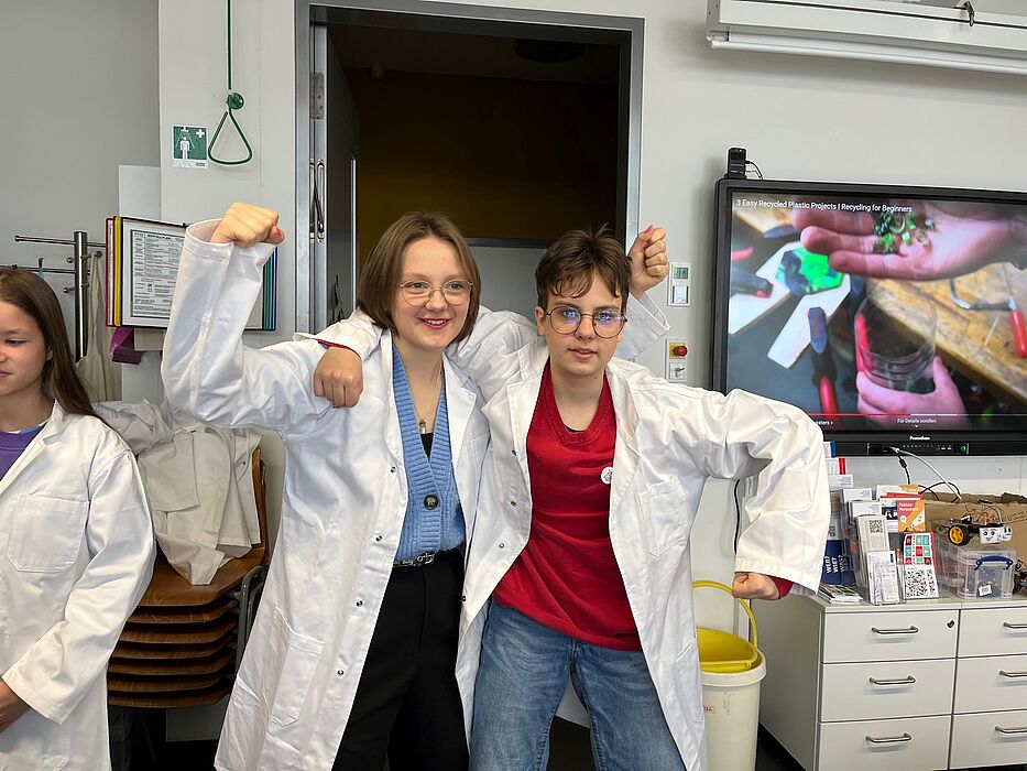 Klimawandel – was für eine Zukunft kommt auf uns zu? Wie können wir sie beeinflussen? Wie können wir uns darauf vorbereiten? Können wir als Einzelne im Alltag den CO2-Ausstoß und Müll vermeiden? Welche Studien- und Fachrichtungen werden wichtig? Die Mädchen der 6. Klasse diskutierten darüber am Hauptcampus Altonaer Straße, experimentierten und stöberten in der Bibliothek im Wissen der Menschheit. Bei Dr. Julian Sartori, Leiter des Schüler:innenforschungszentrums an der FH Erfurt, ging es dabei ganz wissenschaftlich-praktisch zu. Die Sechstklässlerinnen beschäftigten sich mit Recycling, lernten verschiedene Polyethylene kennen und recycelten aus alten Milchdeckeln – die übrigens aus der Mensa stammten – und stellten daraus Sterne und Herzen her.