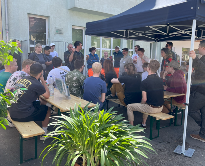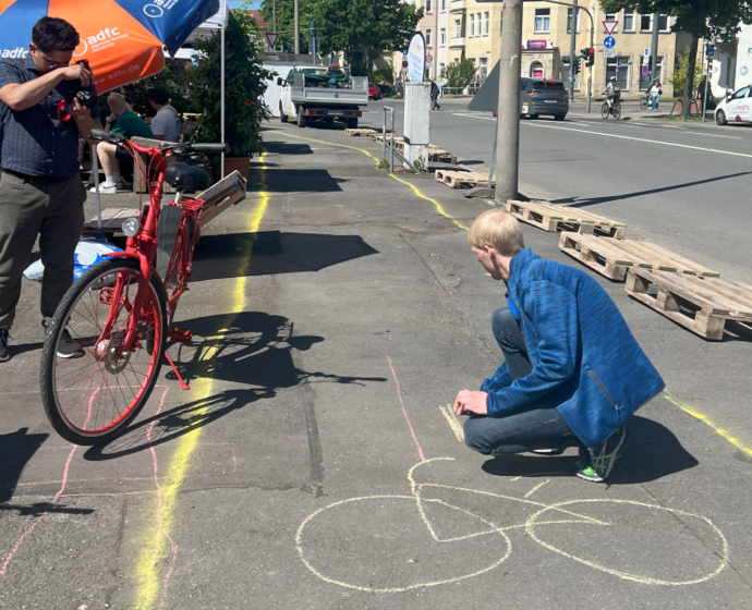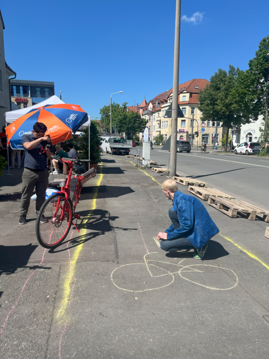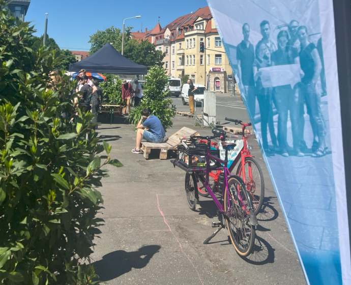Studierende und Promovierende trugen am ersten Tag abgeschlossene und aktuell bearbeitete Themen in den Sessions „Raum gestalten“, „Mobilitätsverhalten“ und „Mobilitätsoptionen“ bei und diskutierten darüber. Von der Forschung auf die Straße ging es beim Real-Labor am zweiten Tag, zu dem das Erfurter Baudezernat einen Quartiersplatz an der Erfurter Häßlerstraße von parkenden Autos „befreite“. Mit diversen Requisiten und perfekter Unterstützung junger Mitarbeitender des Gartenamtes wurde die kahle Asphaltfläche „begrünt“, verschattet, als Ruhezone mit vielen Sitzgelegenheiten – teilweise vom StuRa ausgeliehen – und Konflikte zwischen Fußgehenden und Radfahrenden vermeidend gestaltet.