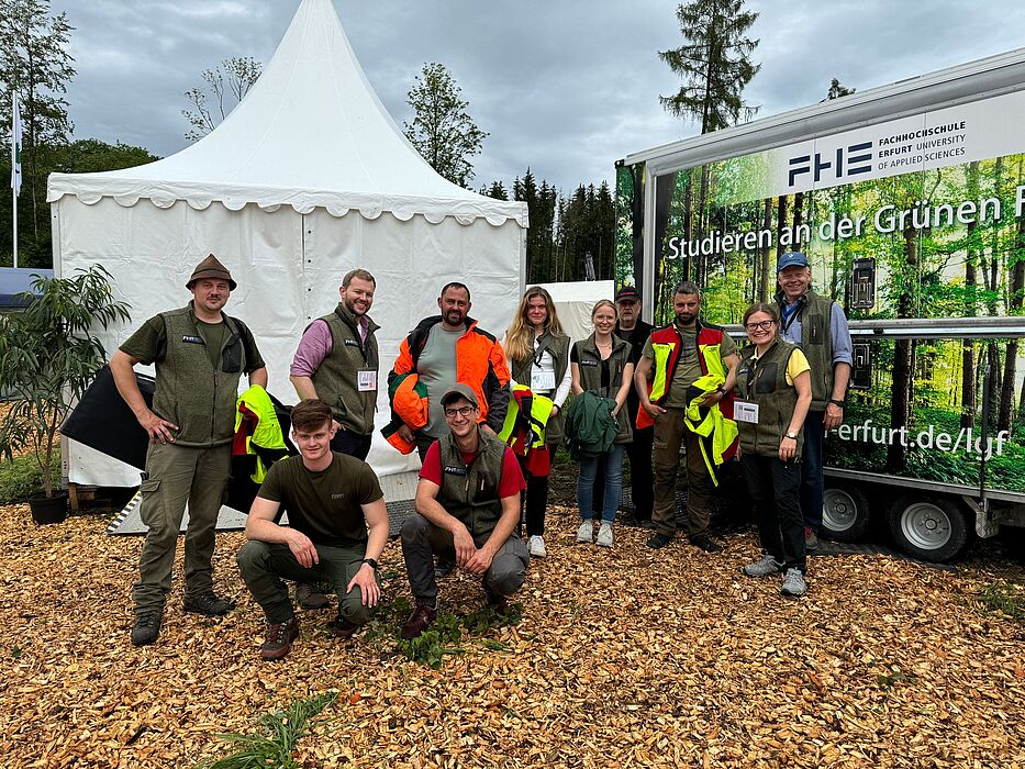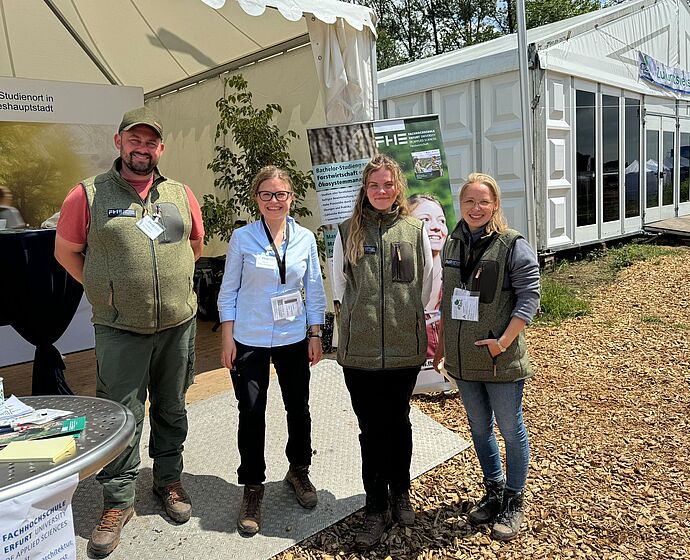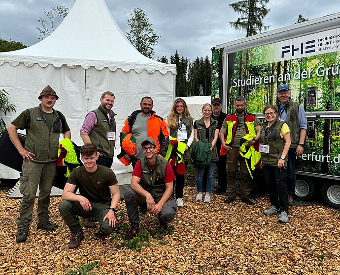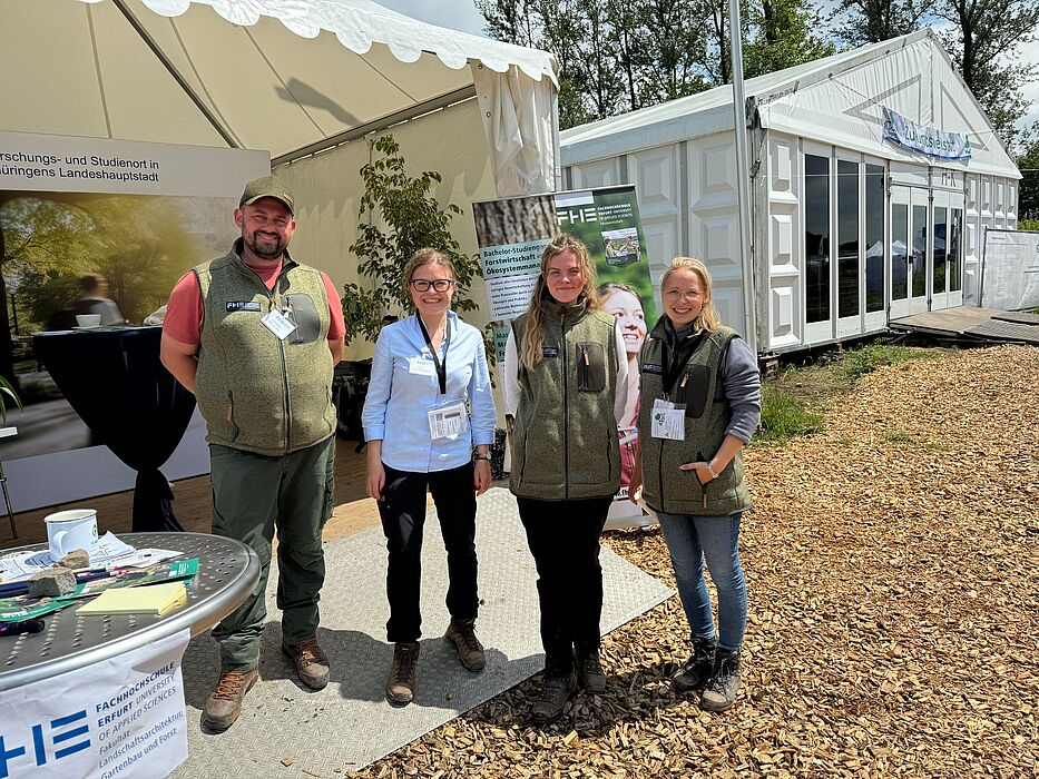 Das Thüringer Kompetenzzentrum HRN organisierte in diesem Jahr gemeinsam mit der Fachhochschule Erfurt und Holz-21-regio einen Gemeinschaftsstand auf der Sonderschau "CampusForst – Forscher für den Forst", um Studium und Lehre im Bereich Forst und neue Forschungs- und Entwicklungsprojekte vorzustellen. Der Gemeinschaftsstand der FH Erfurt zog zahlreiche Studieninteressierte wie auch Absolvent:innen an. Die Besucher:innen suchten vielfältigen Austausch mit den Studierenden und Professor:innen vor Ort. Dabei bildeten Mitarbeitende und Studierende aller Bereiche der Fakultät Landschaftsarchitektur, Gartenbau und Forstwirtschaft und des Präsidiums der FH Erfurt das Team des Gemeinschaftsstandes.