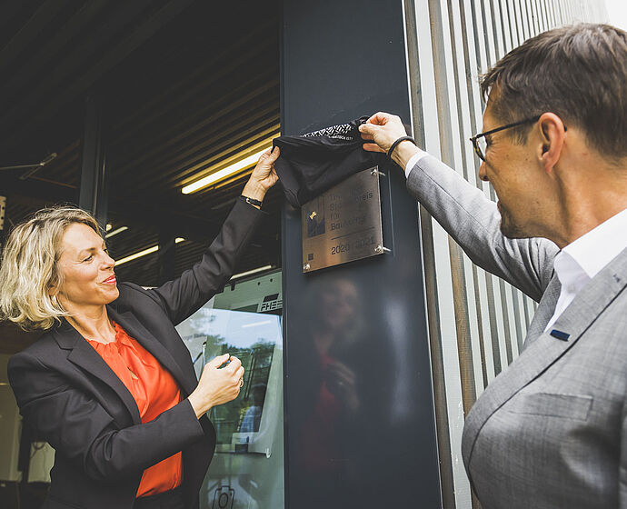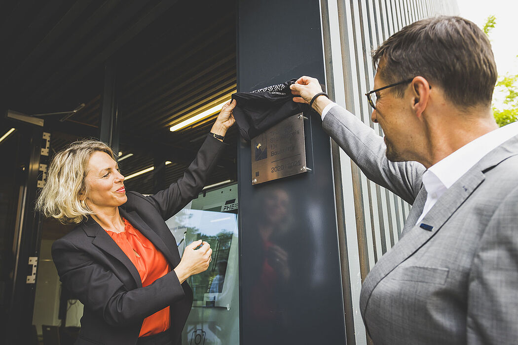 Der Hörsaal-Neubau „Green Campus“ der Fachhochschule Erfurt ist Träger des erstmals ausgelobten Thüringer Staatspreises für Baukultur 2020/2021. Nachdem der Preis bereits im September vergangenen Jahres offiziell verliehen wurde, enthüllte Bauministerin Susanna Karawanskij heute mit dem Präsidenten der FH Erfurt, Prof. Dr. Frank Setzer, eine entsprechende Plakette am „Green Campus“. Dieser konnte somit auch offiziell eröffnet werden, nachdem die Corona-Pandemie dies bislang nicht möglich machte. Zugleich wurde im Rahmen der Veranstaltung das 30-jährige Jubiläum der FH Erfurt gewürdigt.