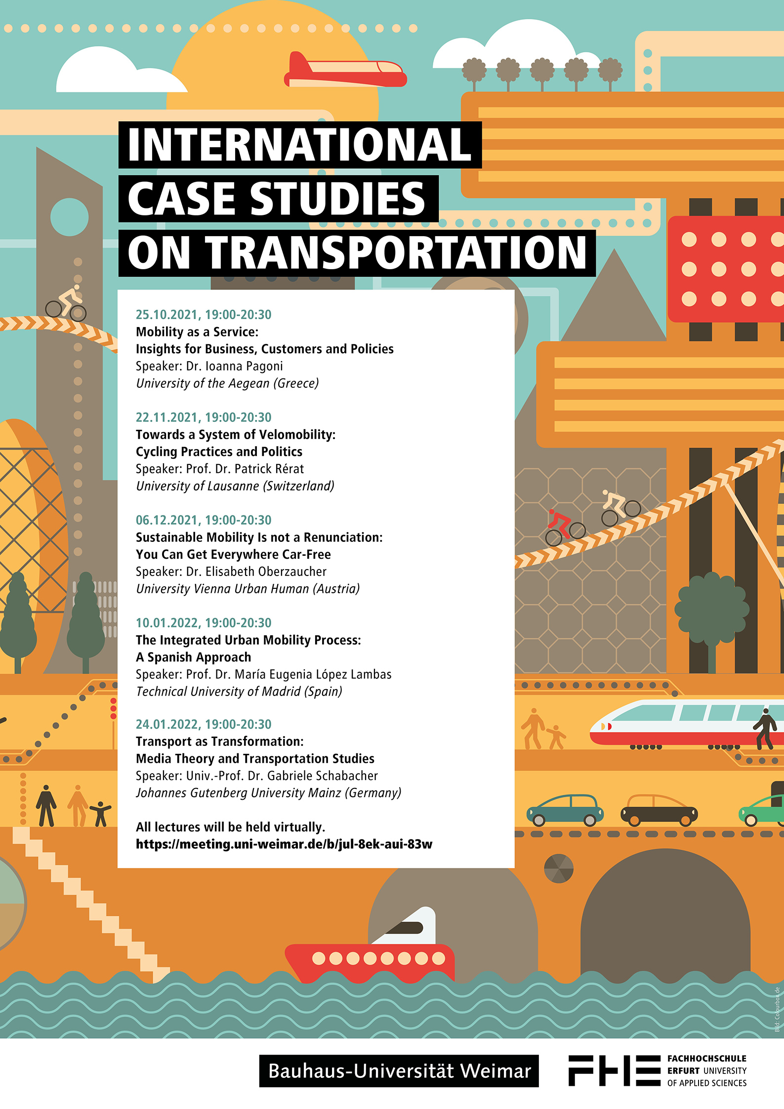 Initiiert wurde die Vortragsreihe erstmalig im Oktober 2018 im Rahmen des „Bauhaus.Semesters“ von der Professur Verkehrssystemplanung an der Bauhaus-Universität Weimar in Kooperation mit dem Institut Verkehr und Raum der Fachhochschule Erfurt. Alle Vorlesungen finden virtuell statt, Interessierte sind herzlich zur Teilnahme an den folgenden Terminen eingeladen: