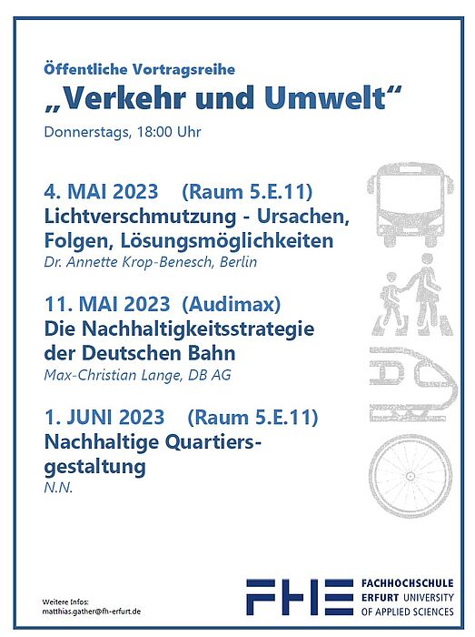 Die öffentliche Vortragsreihe "Verkehr und Umwelt" findet Donnerstags um 18:00 im Audimax oder Raum 5.E.11 der FH Erfurt statt. Insgesamt sind drei Vorträge geplant:
