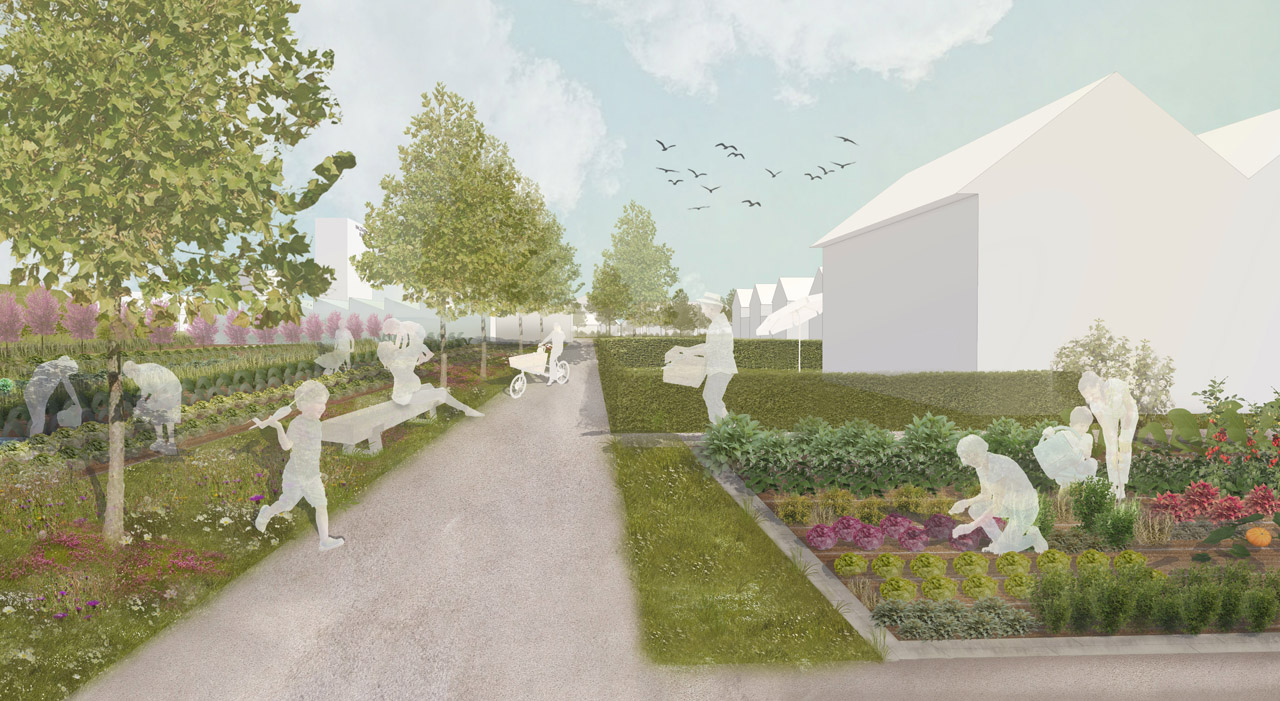 Die städtebaulich-freiraumplanerische Struktur schafft dabei räumlich-funktionale Synergien aus Anbau, Verarbeitung und Vermarktung und bietet gleichzeitig unterschiedliche Bewirtschaftungsformen für landwirtschaftliche Produktionen. Neben der professionellen Bewirtschaftung der Ackerflächen durch Landwirtschaftsbetriebe am Siedlungsrand gibt es Miet- und Genossenschaftsgärten für die Anwohner*innen. Die wohnungsnahen Gärten können je nach Interesse und Bedarf vorzugsweise landwirtschaftlich, aber auch zur Freizeitgestaltung genutzt werden.