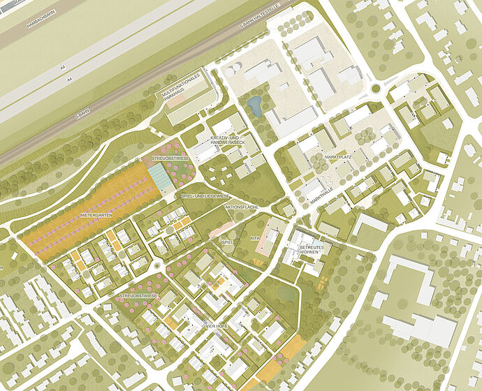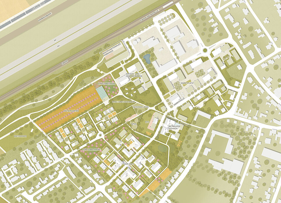 Ein differenziertes Wohn- und Freiraumangebot für unterschiedliche Wohnansprüche und Lebensmodelle soll insgesamt eine neue ländlich-urbane Qualität bewirken, die zur Attraktivierung und Stabilisierung des Ortes beiträgt.