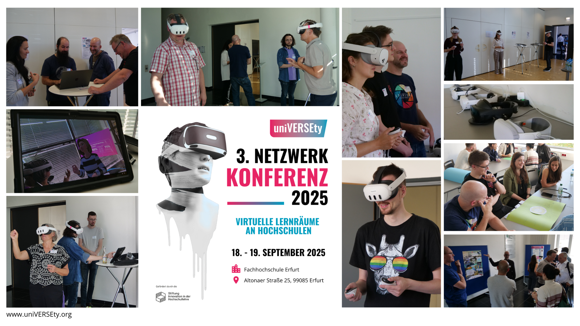 Am 18. und 19. September 2025 fand die dritte uniVERSEty-Netzwerkkonferenz zum Thema "Virtuelle Lernräume an Hochschulen" an der Fachhochschule Erfurt statt. Im Mittelpunkt standen immersive Lernräume, virtuelle Technologien und die Weiterentwicklung des Hochschulnetzwerks. Die Veranstaltung wurde von Prof. Rolf Kruse und Jacqueline Schuldt [GTI] organisiert.