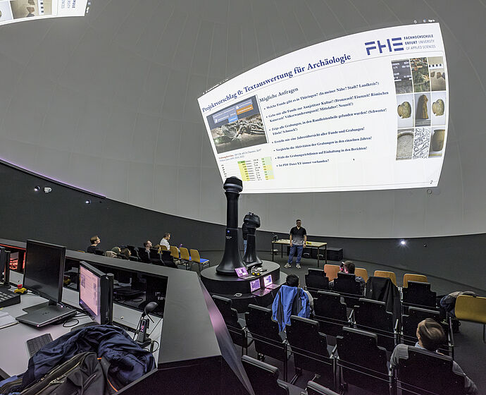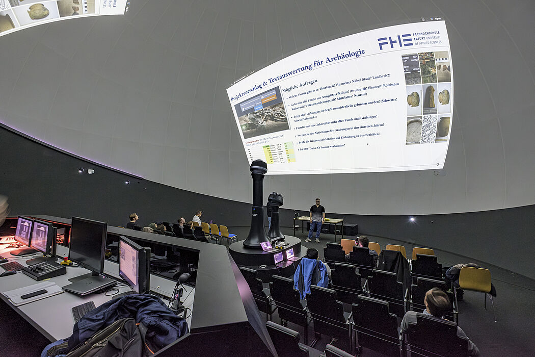 Jena – Am 28.02.2025 besuchten zehn Masterstudierende des Studiengangs Angewandte Informatik der Fachhochschule Erfurt im Rahmen des Seminarfachs „Advanced Analytics“ den ZEISS Demo Dome in der Tatzendpromenade, Jena. Dieses spezielle Planetarium ist ein reines Forschungs- und Entwicklungsplanetarium und normalerweise nicht der Öffentlichkeit zugänglich. Begleitet wurden die Studierenden vom Dekan der Informatik, Prof. Dr. Steffen Avemarg, sowie dem Seminarverantwortlichen, Prof. Dr. Marcel Spehr. Vor Ort empfingen Mitarbeiter und Verantwortliche der Abteilung ZEISS Planetarien die Gäste und begleiteten sie durch die Präsentationen.