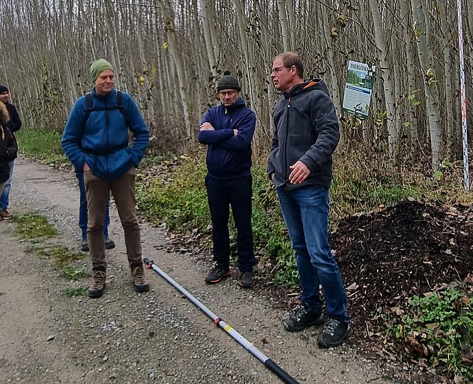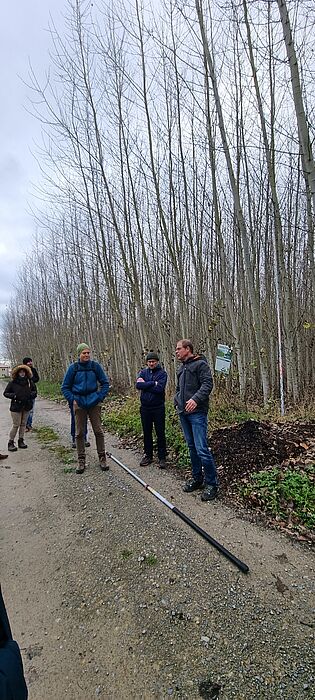 Am darauffolgenden Freitag, 17.11.23, wurde eine Exkursion zu einer KUP nach Porstendorf und in das Bioenergiedorf Schlöben durchgeführt. Konnten sich die Teilnehmer in Porstendorf vom Wuchspotential verschiedener Pappelsorten überzeugen (siehe Foto), stand im Bioenergiedorf Schlöben die Verwertung von Holz zur regionalen Energieerzeugung im Mittelpunkt des Interesses.