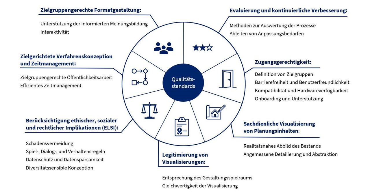 Weiterhin beinhaltet die Handreichung Qualitätsstandards, um eine erfolgreiche und faire Beteiligung der Bürger:innen zu gewährleisten, insbesondere durch einen ethisch und rechtlich verantwortungsvollen Einsatz von XR-Technologien, eine zielgruppengerechte Öffentlichkeitsarbeit, Barrierefreiheit, Benutzerfreundlichkeit und Zugänglichkeit der XR-Anwendungen. Weitere Kriterien betreffen die Gewährleistung einer hohen Qualität der Beteiligung, indem Bürger:innen zur Beteiligung motiviert werden, ihre informierte Meinungsbildung unterstützt wird, die 3D-Darstellungen möglichst sachdienlich und verständlich gestaltet werden und eine Evaluierung der XR-gestützten Prozesse erfolgt.