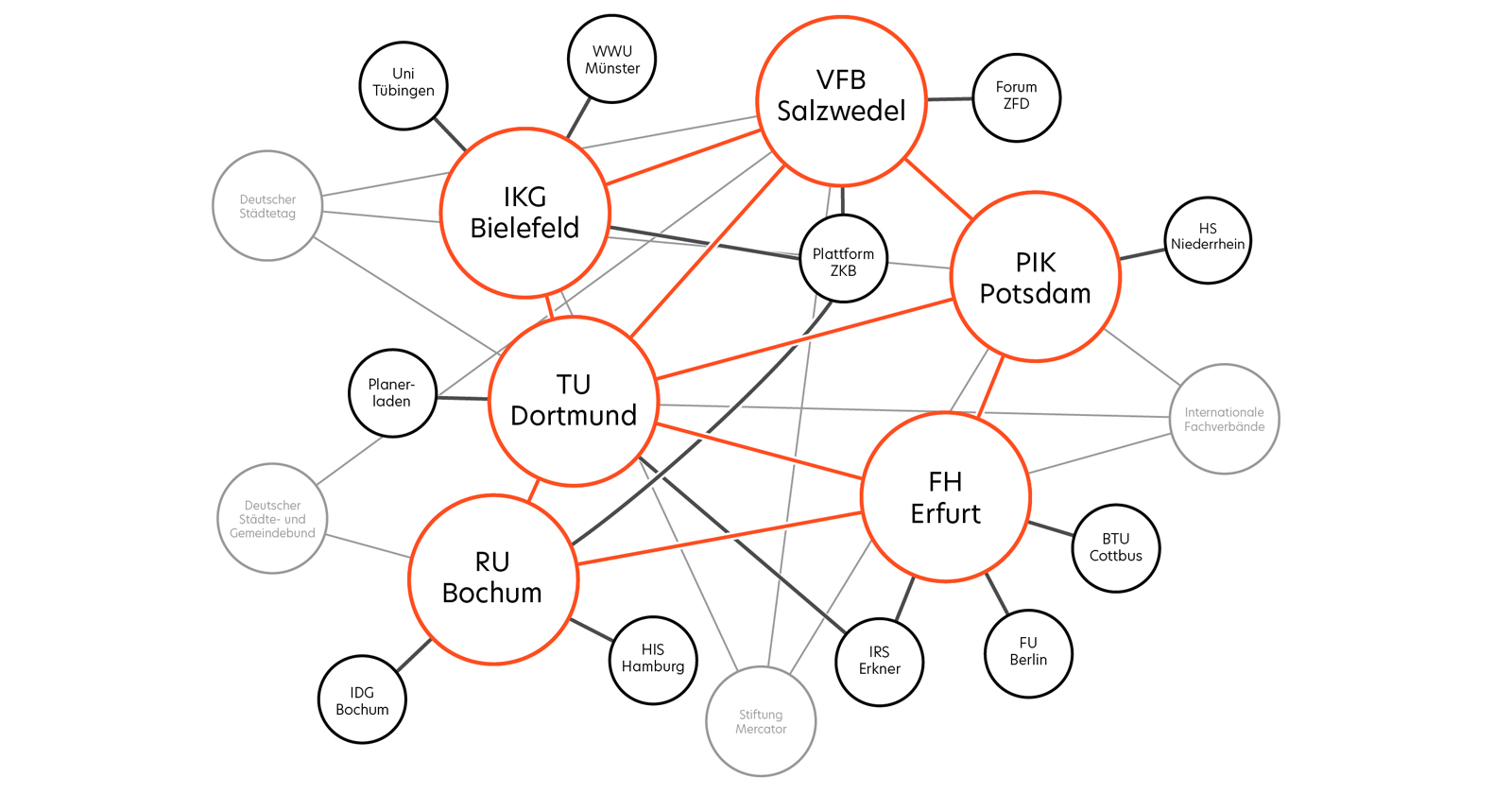 Die Verbundkoordination liegt bei der Fachhochschule Erfurt (FHE), Fakultät Architektur und Stadtplanung. Verbundpartner sind das Kompetenzzentrum Kommunale Konfliktberatung im Verein zur Förderung der Bildung – VFB Salzwedel e.V., das Institut für interdisziplinäre Konflikt und Gewaltforschung der Universität Bielefeld, die Ruhr-Universität Bochum (RUB) (Lehrstuhl für Sozialtheorie und Sozialpsychologie), die Fakultät Raumplanung der Technischen Universität Dortmund (TU DO) und das Potsdam-Institut für Klimafolgenforschung e.V. (PIK). In den vier Jahren Projektlaufzeit richtet jeder Partner eine sogenannte „Traveling Conference“ aus, zu der auch Forscher*innen vor Ort eingeladen sind. Die „Traveling Conference“ an der FH Erfurt findet voraussichtlich im Sommer 2025 statt.