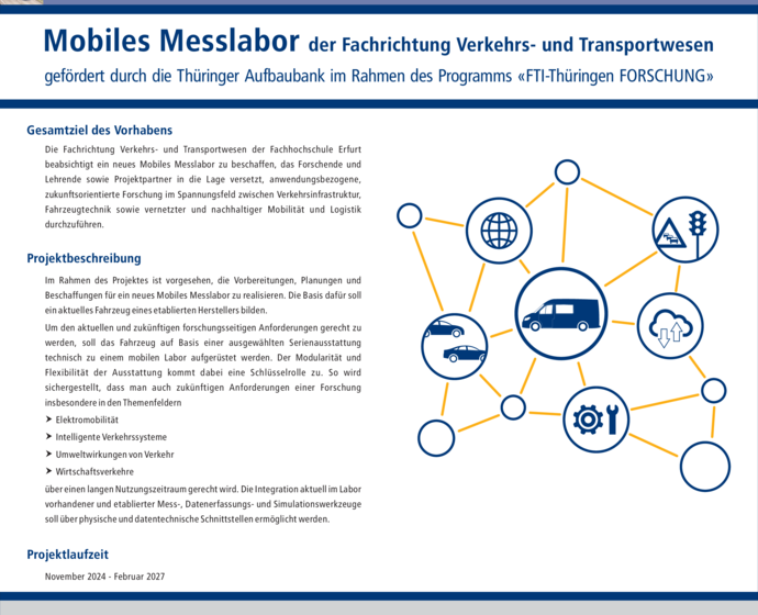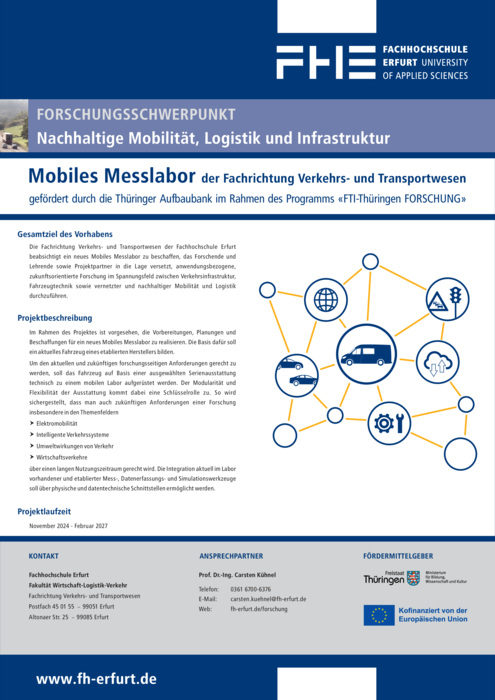 Die Fachrichtung Verkehrs- und Transportwesen der Fachhochschule Erfurt beabsichtigt ein neues Mobiles Messlabor zu beschaffen, das Forschende und Lehrende sowie Projektpartner in die Lage versetzt, anwendungsbezogene, zukunftsorientierte Forschung im Spannungsfeld zwischen Verkehrsinfrastruktur, Fahrzeugtechnik sowie vernetzter und nachhaltiger Mobilität und Logistik durchzuführen.
