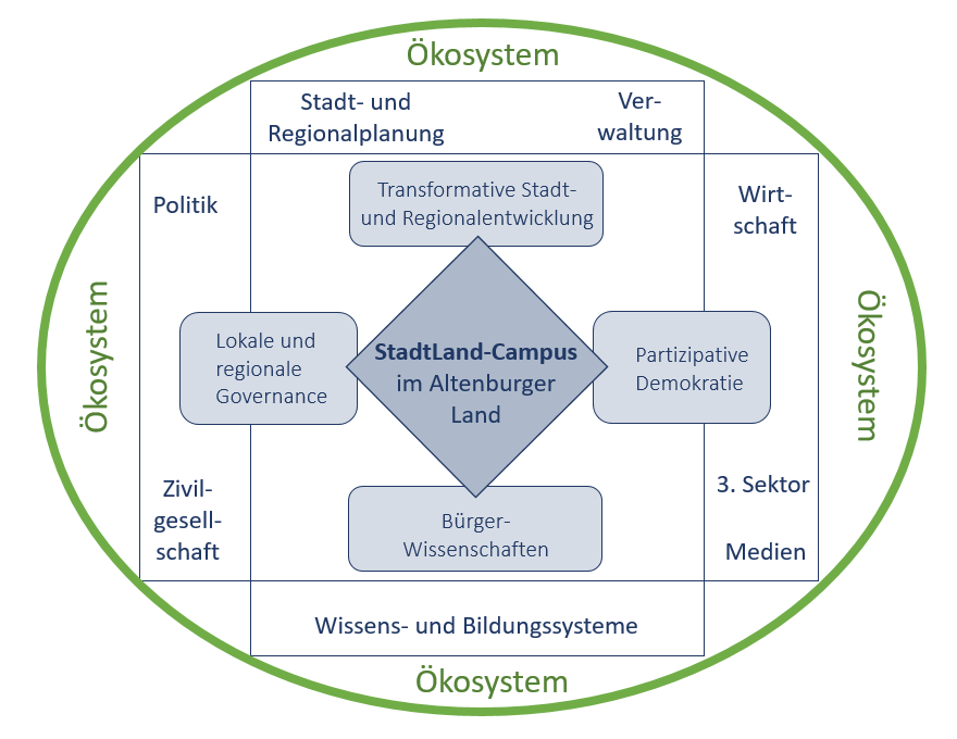 Das Projekt „StadtLand-Campus Altenburger Land“ stellt sich den aktuellen Herausforderungen des Strukturwandels im Altenburger Land und entwickelt eine Konzeption, die die Potentiale der Region und ihrer vielfältigen Akteurslandschaft in den Blick nimmt. Er soll die Zusammenarbeit mit den Hochschulen im regionalen Umfeld auf eine dauerhafte Grundlage stellen. Ziel ist die Vorbereitung für die konkrete Umsetzung eines räumlich verorteten Campus im Altenburger Land.