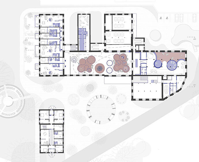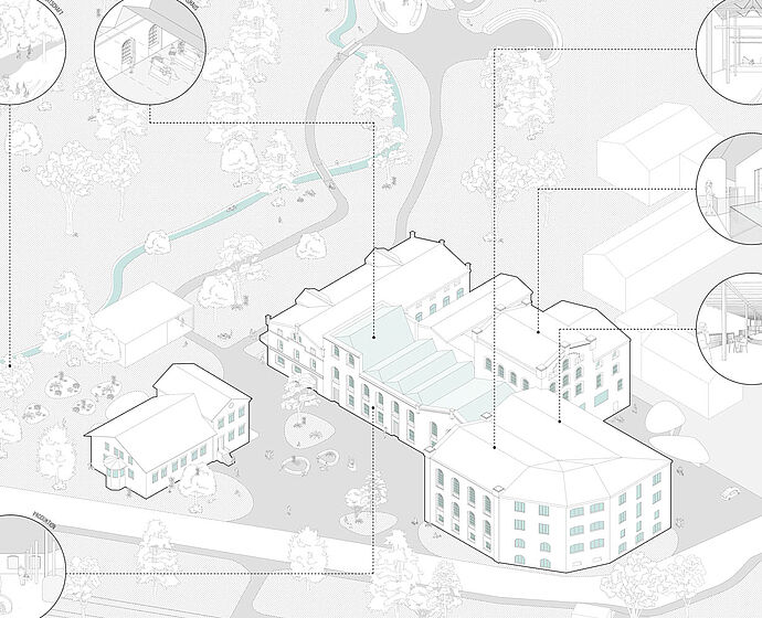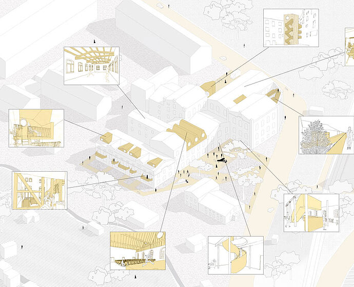 Im Wintersemester 2021-22 wurde die ab dem Jahr 1872 errichtete Schokoladenfabrik in Greußen in einem Master-Projektstudio mit Begleitseminar behandelt. Insgesamt 17 Studierende erarbeiteten eine umfängliche Bestandserfassung und erstellten Nutzungskonzepte und Entwürfe für die Nachnutzung dieses städtebaulich und architektonisch hochwertigen Gebäudeensembles. Der Gebäudekomplex mit mehr als 6.500 m2 Nutzfläche besteht aus dem ehemaligen Fabrikgebäude, das sich in mehrere 2- bis 4-geschossige Baukörper gliedert und der ehemaligen Fabrikantenvilla. Direkt an der Bahnstrecke Erfurt - Nordhausen gelegen bildet die Fabrik zusammen mit dem jenseits der Gleise gelegenen ehemaligen Bahnhofsgebäude, das inzwischen zu einem Wohnprojekt umgebaut wurde ein einladendes städtebauliches Ensemble. Die Entwürfe der Studierenden stellen Zukunftsperspektiven für zu Projektbeginn vom Abriss bedrohte Objekt dar. Aufbauend auf analytischen Untersuchungen wurden die Potentiale des Standortes aufgedeckt, neue Nutzungsszenarios gefunden und in konkrete Raumprogramme übersetzt. Dabei wurden nicht nur die aktuellen gesellschaftlichen und wirtschaftlichen Entwicklungen betrachtet wie z.B. die Situation auf dem Wohnungs- und Immobilienmarkt, mögliche Bedarfe der regionalen Gründerszene und eine vielerorts ablesbare Tendenz, den Lebensmittelpunkt aus den Städten in ländliche Gebiete zu verlagern. Auch der bestehenden Bausubstanz wurde als Ressource eine zentrale Rolle eingeräumt. Die eingehende Untersuchung des Gebäudebestands und der vielfältigen historischen Baukonstruktionen lieferte Grundlage und Inspiration für Entwürfe baulich-räumlicher Interventionen, die die Schokoladenfabrik als Stadt-Land-Hub zum Wohnen und Arbeiten und für kulturelle und soziale Nutzungen neu etablieren könnten.