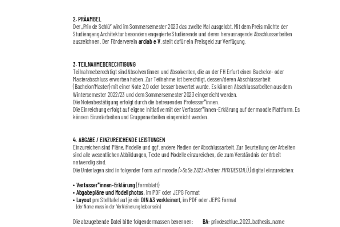 prixdeschlue_2023_auslobung_230608_pw arclab Alumni und Freund:innen des Studiengangs Architektur der FH Erfurt e.V. GLS Gemeinschaftsbank eG Sitz Erfurt VR 163169 IBAN: DE83 4306 0967 1282 2722 00 Steuernummer 151/141/15956 BIC: GENODEM1GLS „PRIX DE SCHLÜ“ 2023 | AUSLOBUNG / STATUTEN 1. AUSLOBER*IN