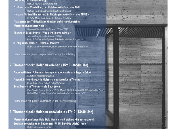 PowerPoint-Präsentation 1. Themenblock: Holzbau ermöglichen (13:00 -14:40 Uhr) Eröffnung der Veranstaltung Prof. Dr.-Ing. Antje Simon, FH Erfurt Grußwort und Vorstellung der Holzbauaktivitäten des TMIL Prof. Dr.-Ing. Barbara Schönig, Staatssekretärin TMIL Holzbau für den Klimaschutz in Thüringen: Ak