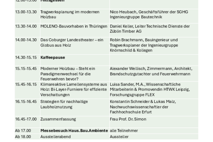 Uhrzeit Vortragstitel Referent 10.30-10.45 Begrüßung durch den Veranstalter Prof. Dr. Frank Setzer, Präsident der Fachhochschule Erfurt 10.45-11.00 Grußwort des Ministers Steffen Schütz, Thüringer Minister für Digitales und Infrastruktur 11.00-11.30 Holzbaukultur in Thüringen Katja Fischer, Vorständ
