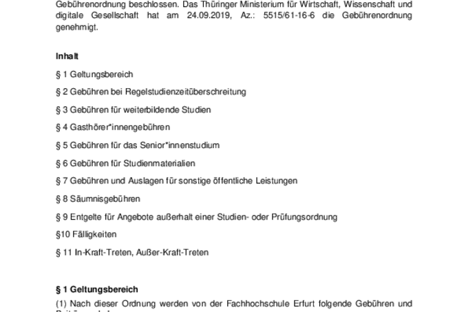Verkündungsblatt der Fachhochschule Erfurt/Nr. 75 Nr. 75 Sechzehnter Jahrgang Seite 369 von 462 SoSe 2019 30.09.2019 Allgemeine Gebührenordnung der Fachhochschule Erfurt Gemäß §§ 3 Abs. 1, 29 Abs. 1 S. 1 Nr. 8 des Thüringer Hochschulgesetz vom 10. Mai 2018 (GVBl. S. 149), zuletzt geändert durch Arti