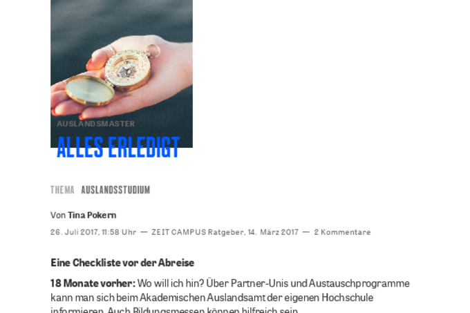 Auslandsmaster: Alles erledigt | ZEIT Campus Eine Checkliste vor der Abreise 18 Monate vorher: Wo will ich hin? Über Partner-Unis und Austauschprogramme kann man sich beim Akademischen Auslandsamt der eigenen Hochschule informieren. Auch Bildungsmessen können hilfreich sein. 15 Monate vorher: Welche