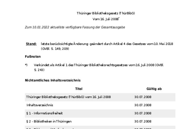 - Seite 1 von 3 - Amtliche Abkürzung: ThürBibG Ausfertigungsdatum: 16.07.2008 Gültig ab: 30.07.2008 Dokumenttyp: Gesetz Quelle: Fundstelle: GVBl. 2008, 243 Gliederungs-Nr: 2000-23 Thüringer Bibliotheksgesetz (ThürBibG) Vom 16. Juli 2008* Zum 10.01.2022 aktuellste verfügbare Fassung der Gesamtausgabe
