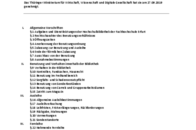 BENUTZUNGSORDNUNG 24-07-2019 1 BENUTZUNGSORDNUNG DER HOCHSCHULBIBLIOTHEK DER FACHHOCHSCHULE ERFURT Gemäß §§ 3 Abs. 1, 29 Abs. 1 Satz 2 Nr. 8, 35 Abs. 1 Nr. 14 in Verbindung mit § 44 Abs. 1 des Thüringer Hochschulgesetzes (ThürHG) vom 10. Mai 2018 (GVBl. S. 149), geändert durch Artikel 128 des Gesetz