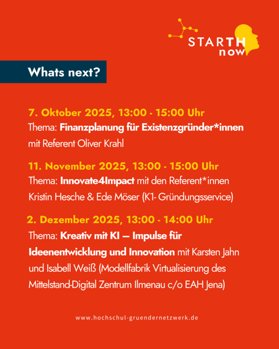 Das Thüringer Hochschulgründungsnetzwerk „StarTH“ vereint die Gründungskompetenz der Thüringer Hochschulen. Gemeinsam wird Gründer:innen ein einzigartiges Netzwerk, inspirierende Events und Zugang zu Expertenwissen geboten. Mehr Informationen über den Workshop-Reihe finden Sie hier StarTH NOW.